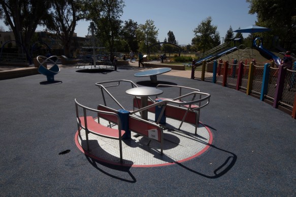 The two parks-related items on this week’s agenda were both part of the “consent calendar,” which means that normally they’d be dealt with in a single vote, without comment. One in particular—the Magical Bridge Playground—rose above the rest, however. The Council was presented with a short video introducing the concept, and a couple of the council members spoke up in praise of the project. Although I had previously heard mention of it, the meeting was the first time I really got some background on what Magical Bridge is all about. I subsequently paid a visit to the existing Magical Bridge Playground in Palo Alto to see for myself.