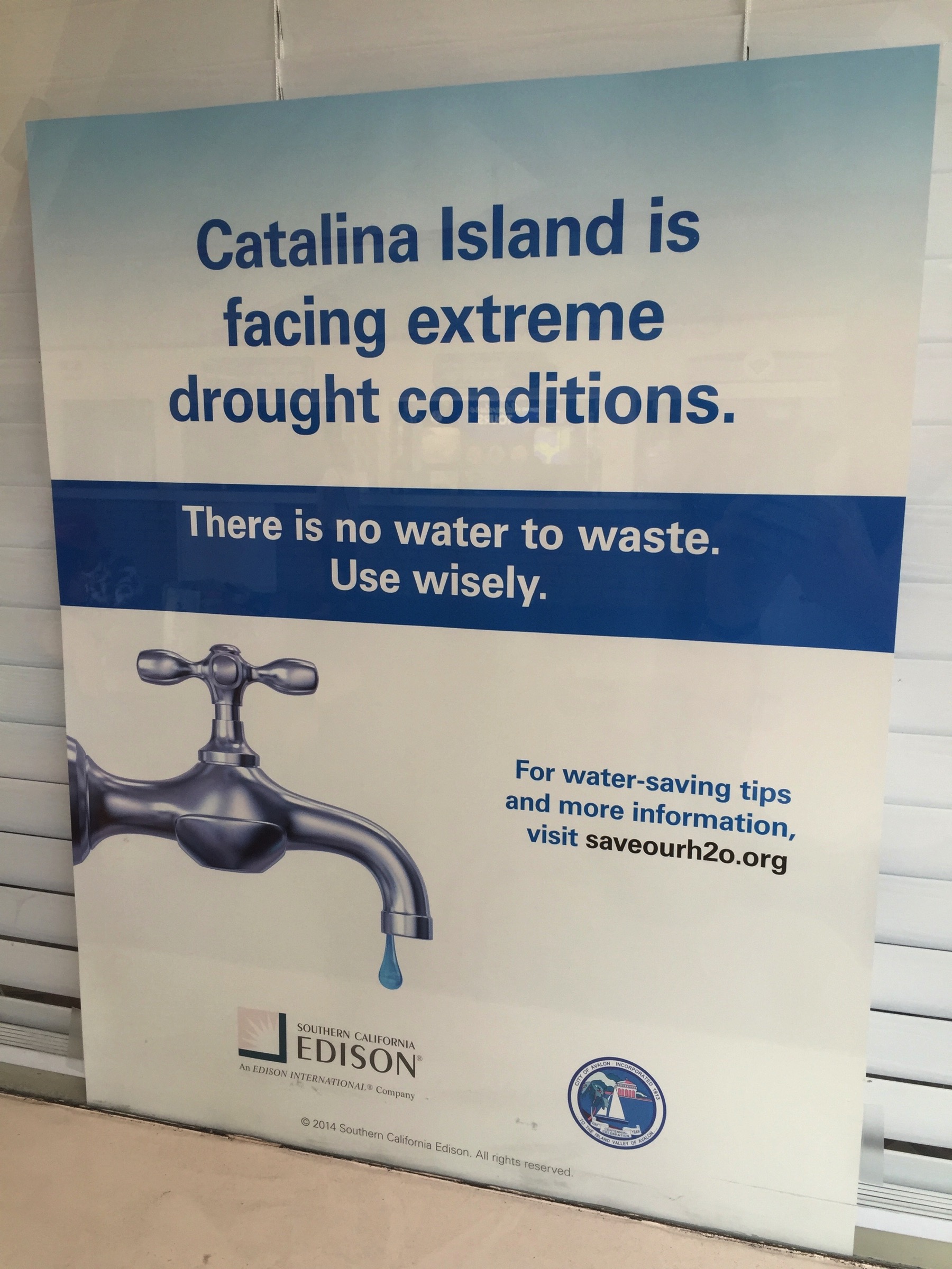 Maintaining a relatively normal way of life on Catalina Island takes quite a bit of effort, it seems. Water is particularly key right now. California is experiencing a drought, but what we here in Redwood City are experiencing is nothing like what Catalina is going through. Historically they’ve gotten all their water from wells and a couple of reservoirs that capture rainwater. But due to changing climactic conditions, the water levels in those wells has been dropping for years now. Years ago Catalina was asked to make deep cutbacks, to the point where not only do the hotels strongly urge you to re-use your sheets and towels, you are asked to take short showers as well. Some restaurants use disposable plates and cutlery so that they don’t have to wash them. And whereas in Redwood City our restaurants won’t bring you a glass of tap water unless you ask them to, on Catalina they won’t bring you a glass of tap water…period. Even in the finest island restaurants, the best they will do is sell you a bottle of water.