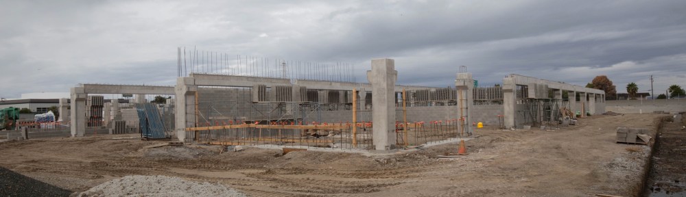 The design for the dealership’s main building is particularly interesting: it will largely sit on “stilts,” leaving almost the entire property at ground level free for the storage of cars. In the above photo those concrete pillars are the stilts upon which the building will stand; the concrete beams that span those pillars will serve to support the two stories of showroom, service department, and offices.