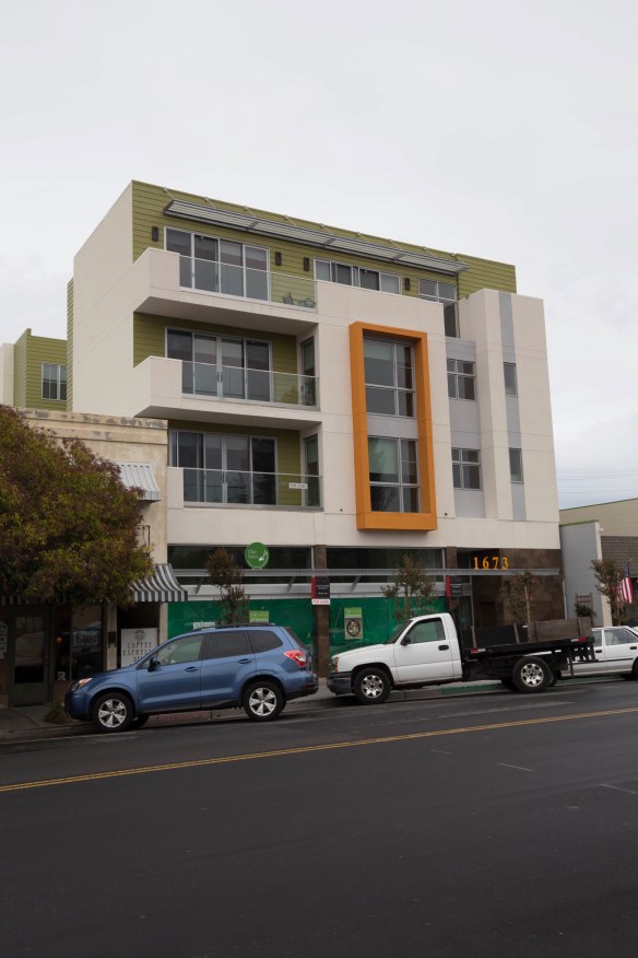 One San Carlos building project that I am glad to finally be able to take off my list—since it seems to be about done—is the four-story mixed-use building located at 1673 Laurel Street (close to Saint Francis Way). As if its pea-green and bright orange accents aren’t enough to make it stand out, the fact that no other building on the block is more than two stories high makes this one hard to miss: