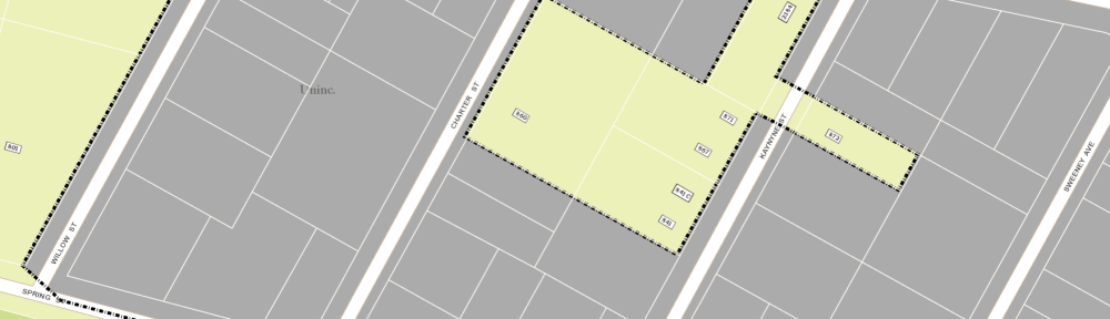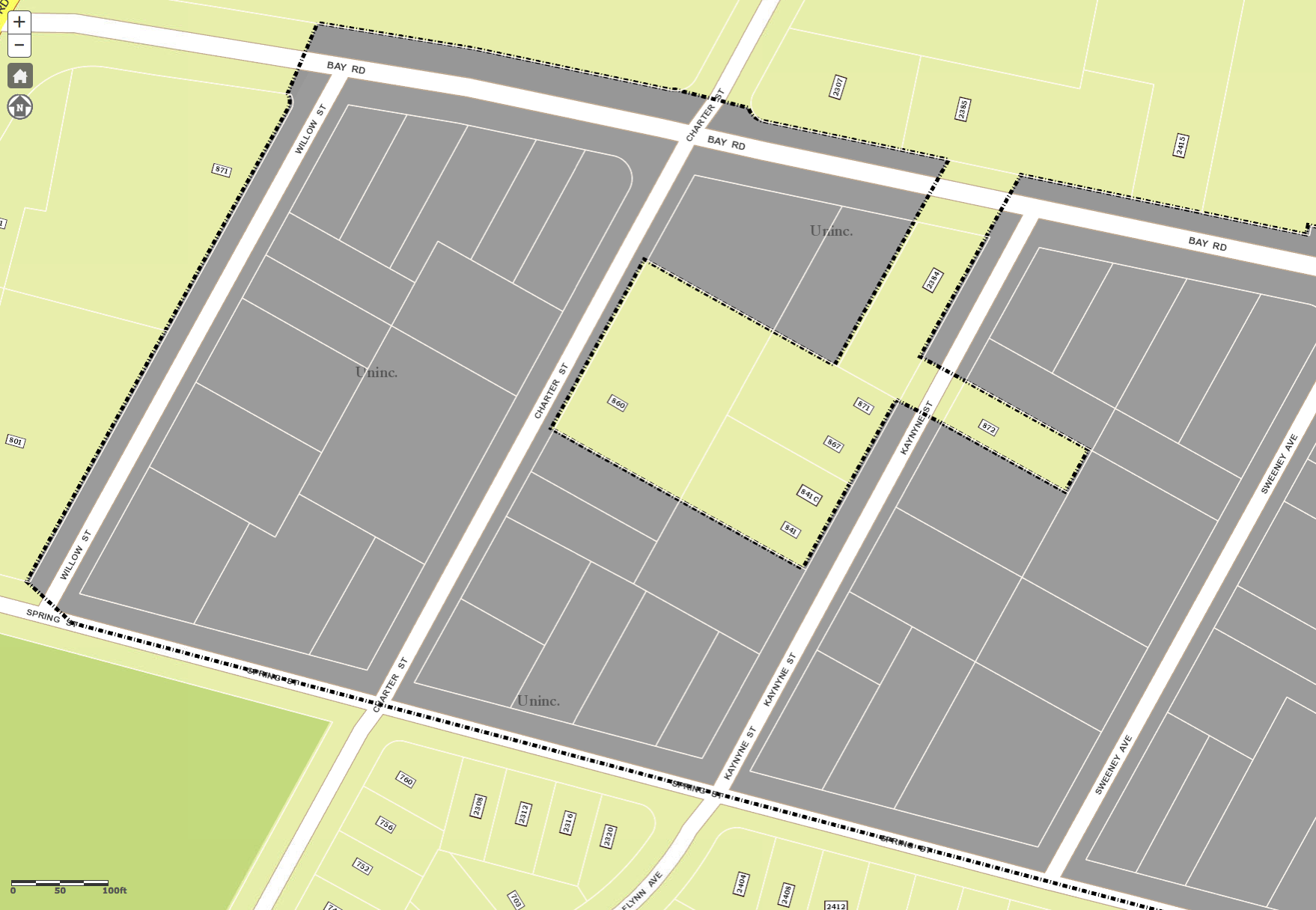 Something similar occurs with the one parcel on the right side of Kaynyne Street (labeled 872) that is within the city; it, along with the two gray parcels below it, together make up a “doggie day care” business named Planet Pooch: