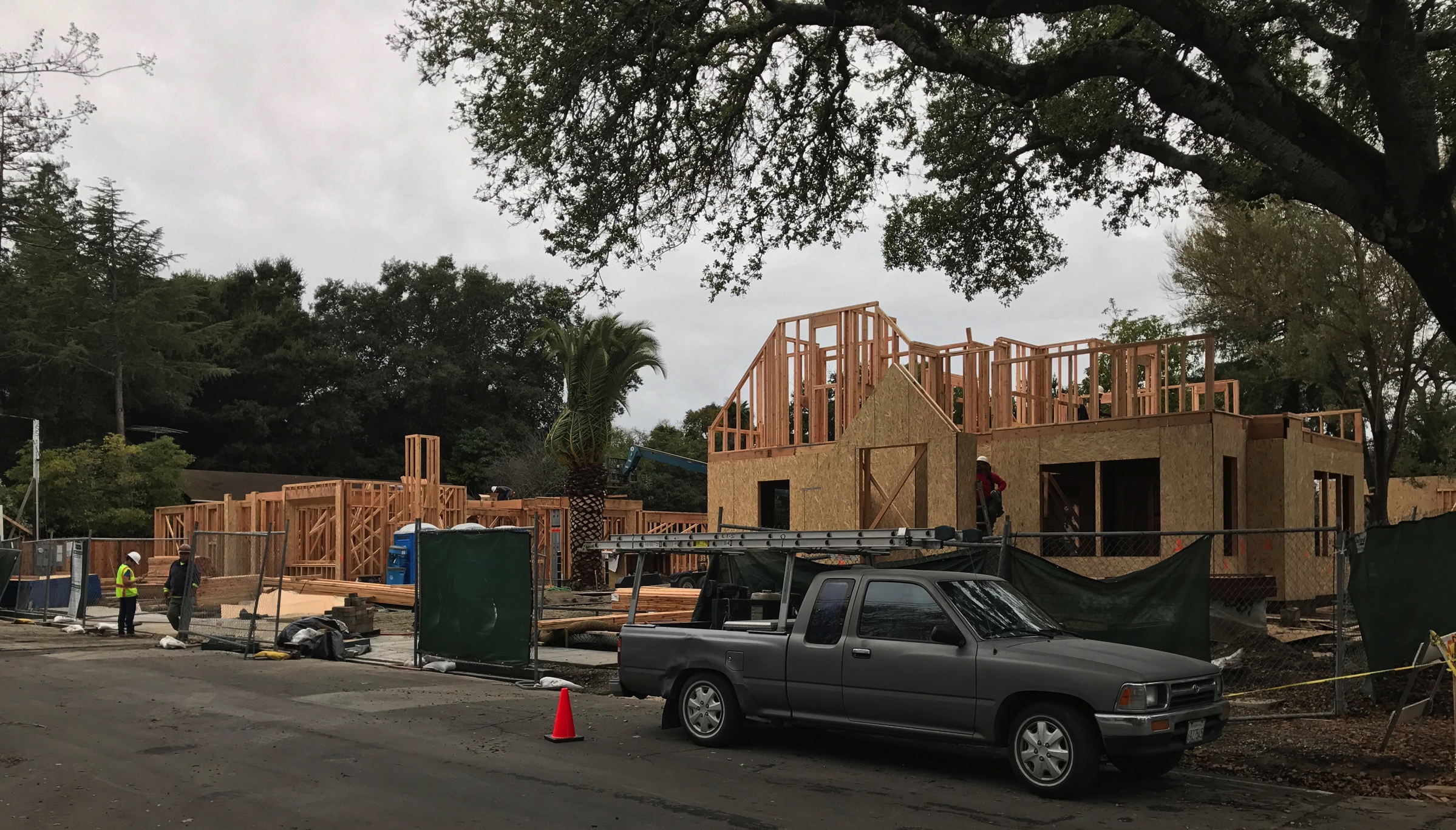 My walk took me on a large loop along our northern border, first to check on the development on Finger Avenue. I’ve reported on this new eight-home subdivision before, most recently in my post Redwood City’s New Green. Back then—in early September—grading had just begun. Now, the two homes closest to Finger Avenue are rapidly taking shape: