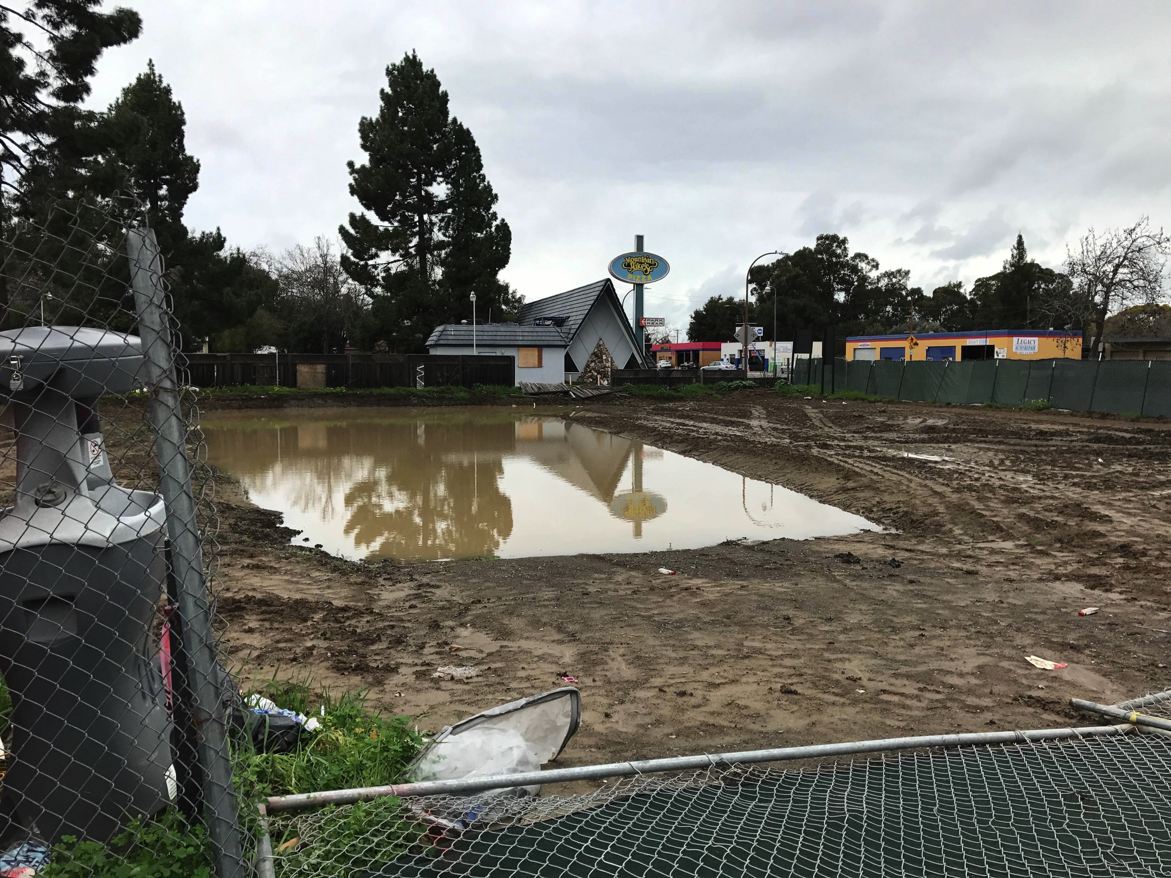 I next swung by the twelve-unit townhouse development that is (slowly) being built at 150 El Camino Real, between the KFC and the old Mountain Mike’s Pizza restaurant. I saw no activity here, and some storm impact: some of the construction fencing appeared to have blown down, and the shallow hole that had been dug in the center of the property was full of water, making it look more like they were building a swimming pool than a set of townhouses: