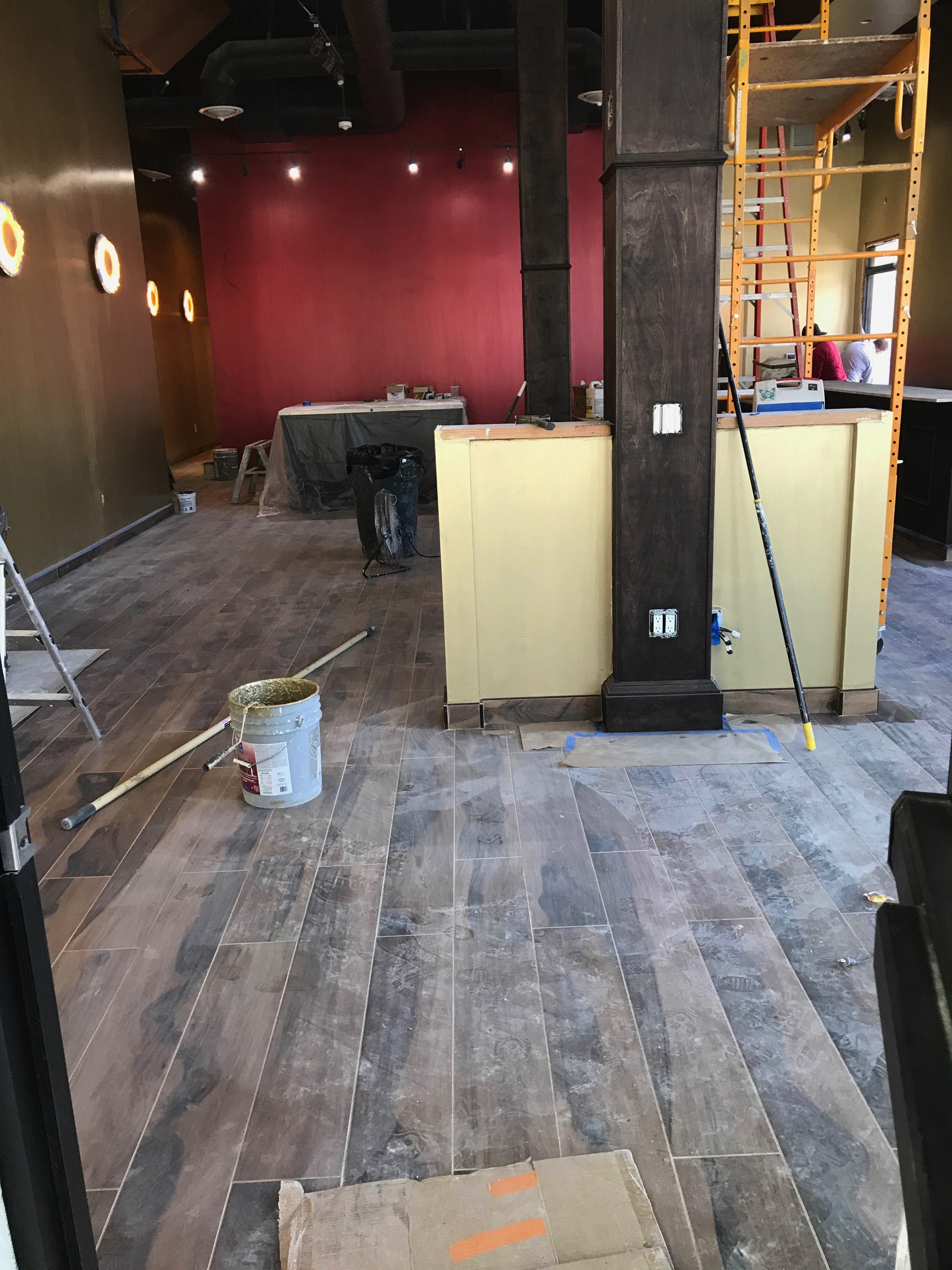 As you can see, they’re getting down to the finishing touches. The floors are in, the walls are painted, the light fixtures have been installed, and cabinets and counters are going in. Those of us who love this place should be eating there again very soon, it seems…