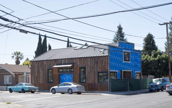 Heading back towards downtown I wandered down Maple Street and was delighted to see the progress being made on the transformation of the old Schroeder Sheet Metal, Inc. shop. Until very recently Schroeder’s, which was located at the corner of Maple and Hilton, made gutters, installed heating and air-conditioning systems, installed skylights, and repaired furnaces. Their classic old building, which sits in a heavily residential area, is being converted into a single-family home. The architect wisely preserved the shape of the original building but has replaced the building’s sheet metal exterior with lovely old barn wood and, along the bottom of the exterior walls and around at least one door, steel plates. When finished this house is going to look terrific: