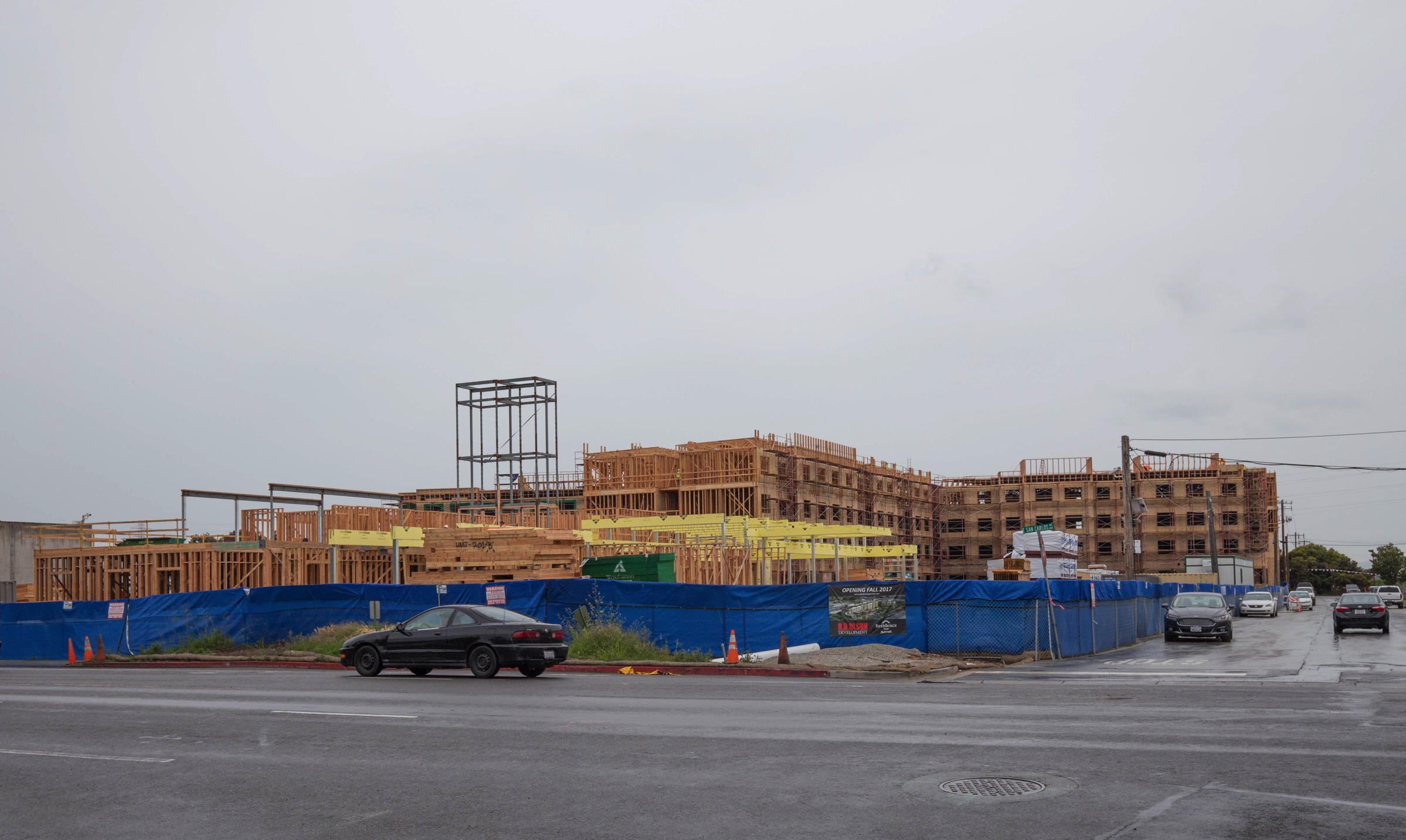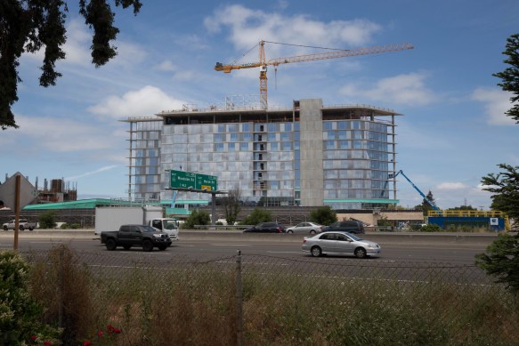 See the metal structure sticking up near the middle of the building? I presume that this will contain the elevator shafts, and thus defines the building’s ultimate height. Although a bit hard to see here, the building is roughly T-shaped, with the stem of the T extending towards the front of this picture, and the top of the T, which parallels Highway 101, along the back.