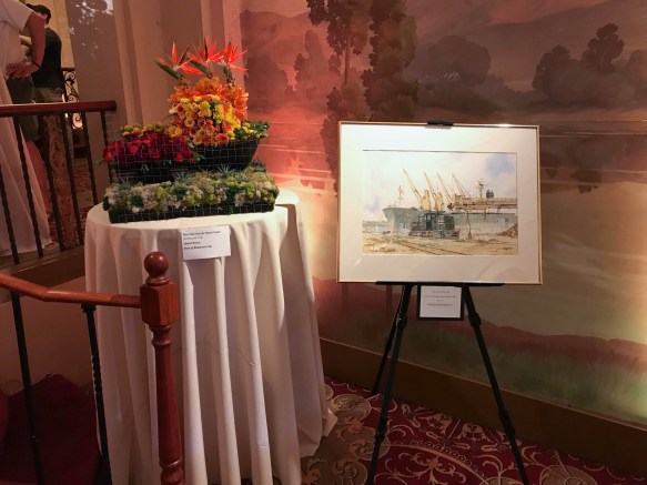 Throughout the Fox Theatre lobby, both upstairs and down, there were artworks done by local artists (including one by our Vice Mayor, Ian Bain!). Paired with each piece of art was a flower arrangement that was either inspired by or was meant to echo the corresponding artwork. Apparently what we saw was similar to the de Young Museum’s annual “Bouquets to Art” exhibition. Both I and my wife (who has attended “Bouquets to Art”) were quite pleased and impressed by what we saw at the Fox: much of the art was really good, and the arrangements were in many cases quite clever. Here is a picture of one that I particularly liked: