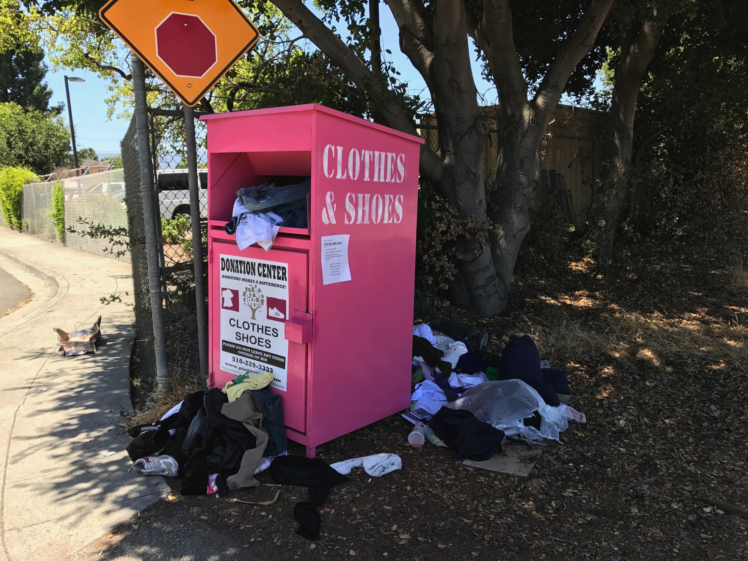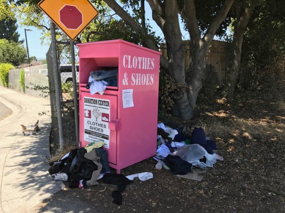 Clothing donation boxes like these are a familiar sight in our area, but the fact that it is a total mess (as they often are, it seems) and is located illegally (I believe) on the railroad right-of-way (the tracks are just to the right of the above picture) ought to get the attention of the nearby Sheriffs, whose vehicles can be seen behind the fence just to the left of the pink clothes box. Oh, and that piece of paper that is stuck to the box is an advertisement by the Auto Pride Car Wash for workers. Litter upon litter surrounded by litter…