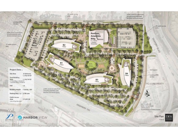 Just so we are clear, the project that Jay Paul Company is hoping to build is a large office complex on roughly 27 acres of land northeast of Highway 101, where the Malibu entertainment center and Lyngso Garden Materials once stood. The property, which consists of some seven separate parcels, is bounded by Highway 101, Seaport Boulevard, Blomquist Street, and the new Maguire Correctional Facility (which sits on Maple Street). Jay Paul Company has been planning this project for some time now: they purchased the properties over a span of years, starting in September 2013 (when they purchased the Malibu Castle Golf & Games property, the Graniterock Building Supplies property, and the Malibu Grand Prix property) and ending in April 2016, when they purchased the Lyngso Garden Materials property.