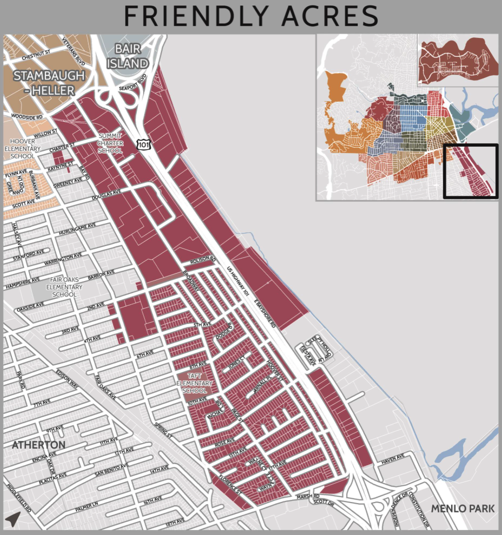 That about does it for Friendly Acres. It is a neighborhood that is about half residential and half light industrial, with a large Stanford presence roughly in the middle. Friendly Acres has great freeway access, extending as it does from Woodside Road on the North to Marsh Road on the South, with Highway 101 running right through the neighborhood. It also has relatively easy access to downtown Redwood City: one need only drive right up Broadway.
