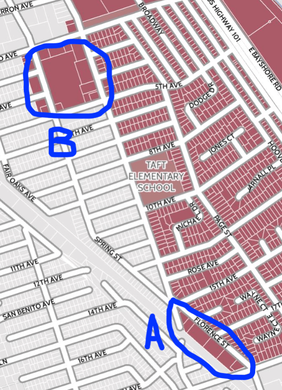 This is one of those places where the city boundaries get really squirrelly. In the circled section the five red parcels are in the city, while the gray parcels that largely surround them are on county land. Of those red parcels, the uppermost one (which sits, like Summit Prep, on Charter Street) contains a large warehouse-style building where Rocketship Education, a private charter school company, hopes to house Redwood City Prep, a K-5 charter school that today is housed on the John F. Kennedy Middle School campus. Rocketship has been working hard to gain the necessary approvals to convert its building and the next-door parking lot (which is actually on county land) into a school, but they are encountering fierce opposition from the surrounding businesses, many of whom point out that siting a school in an area where large trucks make deliveries and pickups at all hours of the day would be both physically and environmentally unsafe for the children attending that school. Thus, although the school has managed to gain approval from the city’s Planning Commission, that approval has been appealed, and thus Rocketship’s future here is as yet uncertain.
