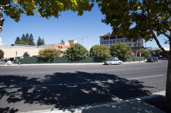 When I say “existing parking lot,” though, you’d be forgiven for not knowing that the site actually is a parking lot: I’m talking about the triangular parcel that sits adjacent to the now-shuttered “Pizza and Pints.” This Winslow Street lot was closed along with the Middlefield Road lot when construction on the Box buildings got underway: it was used as a staging area for construction equipment and materials. When the Box buildings were completed the lot was returned to service, but only briefly: it was once again shuttered when the 815 Hamilton project (that tall building that is being erected right behind the Fox Theatre) got underway, again so that it could be used as a staging area for equipment and materials. So essentially the Winslow Street lot—which has at most 46 parking spaces—has been closed since October of 2013, when the Box buildings broke ground.