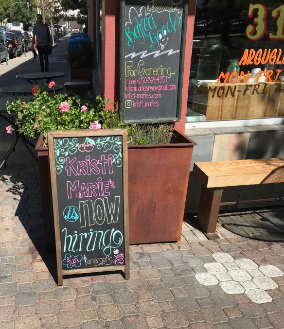 To get back to my walks though, altogether during the first week of October I recorded 121 “help wanted” signs within Redwood City’s borders (which presumably translates to more than 121 actual jobs). Of those, almost exactly half—59—were in the food service industry. Many involved working for big chains—McDonald’s, KFC, Starbucks, Subway, and the like—but some of the jobs meant working for local independent businesses, such as Breaker’s Cafe (in Woodside Plaza), Ohana Express (on Woodside Road), Gourmet Haus Staudt (on Broadway; they were looking for a Sous Chef, and paying $13-$15 an hour), or one of my favorites: Kristi Marie’s, at the corner of Broadway and Arguello.
