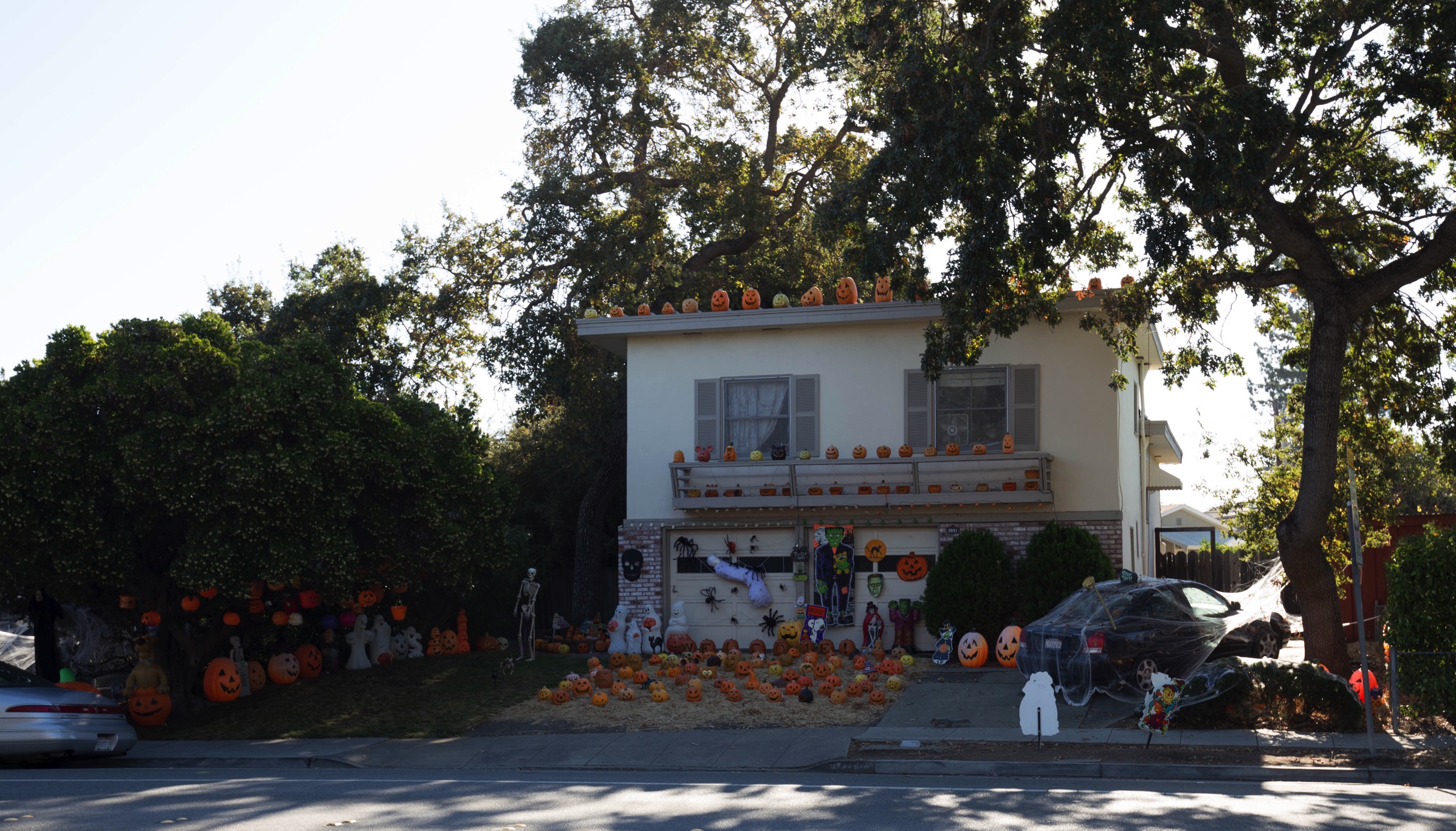 These folks started decorating weeks ago. I first noticed this house back on October 2: they had already placed the row of pumpkins along the roofline and the faux balcony, and had set out the straw bed full of pumpkins on the driveway. Since then they’ve added the decorations on the garage doors, all of the ghosts and pumpkins along the left edge of the property, and the cobwebs and other decorations on and around the car to the right.