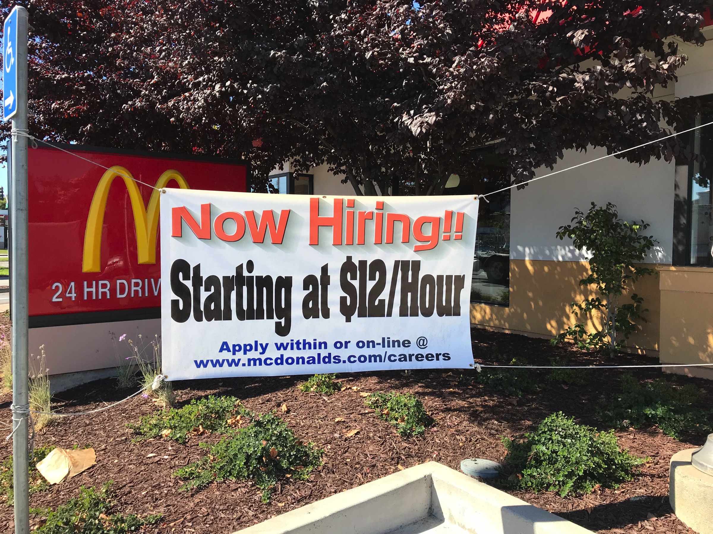 Of the wages I saw posted for these food-service positions, none were less than $12 per hour. The Habit listed wages ranging from $13.50-$17.00 per hour, depending upon experience and, presumably, upon the type of work being done. I was interested to note a bit of competition between the big fast-food chains: while McDonald’s listed a starting wage of $12 per hour, the KFC on El Camino was paying $12.50 per hour, and Wendy’s was apparently paying $13 per hour. Looking for more than just a paycheck? The sign on The Old Spaghetti Factory indicated that they offered “Benefits in compliance with ACA.”