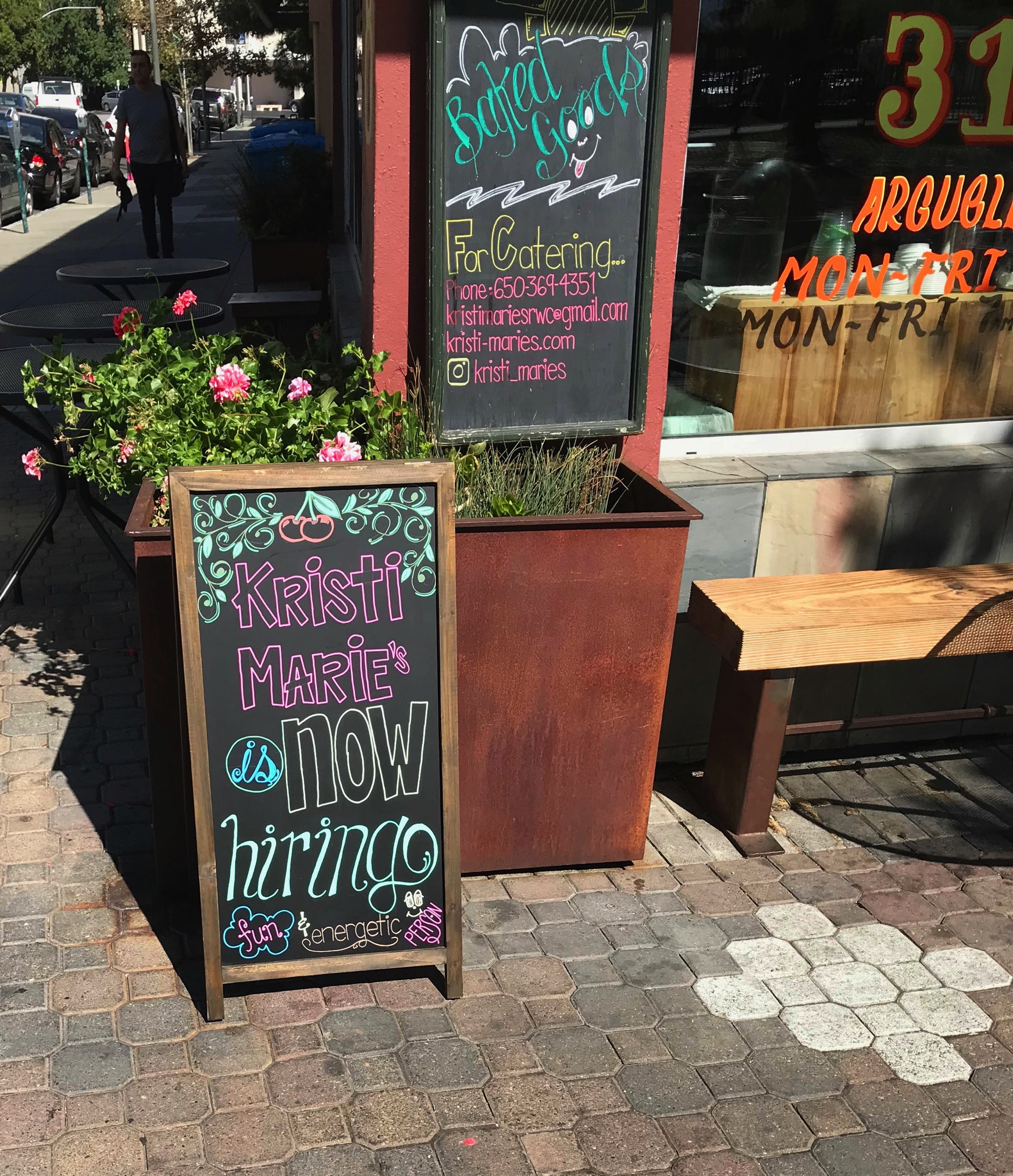 To get back to my walks though, altogether during the first week of October I recorded 121 “help wanted” signs within Redwood City’s borders (which presumably translates to more than 121 actual jobs). Of those, almost exactly half—59—were in the food service industry. Many involved working for big chains—McDonald’s, KFC, Starbucks, Subway, and the like—but some of the jobs meant working for local independent businesses, such as Breaker’s Cafe (in Woodside Plaza), Ohana Express (on Woodside Road), Gourmet Haus Staudt (on Broadway; they were looking for a Sous Chef, and paying $13-$15 an hour), or one of my favorites: Kristi Marie’s, at the corner of Broadway and Arguello.