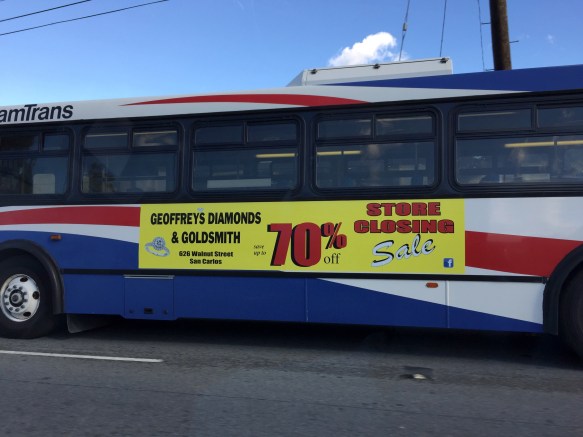 Geoffrey’s is having a giant “store closing” sale with items up to 70% off their original prices. That sale will continue for a couple of more weeks, so if you have a need for some nice jewelry, do check them out. And if you are a die-hard fan of Geoffrey’s, note that they have a second store in Campbell.