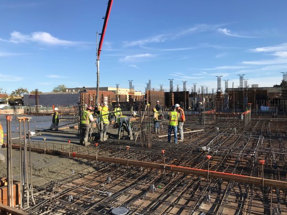 When I discovered Geoffrey’s, I also discovered their second-story balcony, which overlooks Wheeler Plaza. It is a great place to observe the nearby project and to take the occasional picture—although there are some trees that make it less than ideal for photography. Regardless, I’ve been watching the Wheeler Plaza project for quite some time and am impressed with the speed at which the mixed-use project is progressing. The five-story building will ultimately consist of one level of underground parking (for the building’s residents), two more levels of parking fronted by five retail spaces that will face San Carlos Avenue, and three levels of condominiums. Demolition for this project began just about a year ago, and after waiting through most of our last rainy season, by April crews had begun digging for the underground parking level. Now, the underground level is pretty much complete and crews are pouring concrete for the ground-level floors: