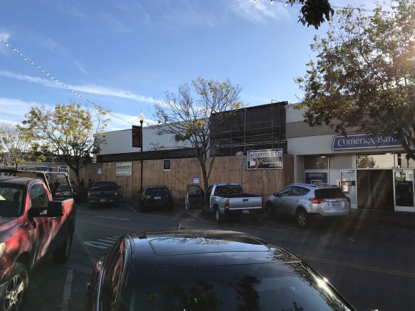 In the above, the portion of the building with the black tar paper along the top (behind the “Davidovits & Co.” sign) will be a retail space for an as-yet unknown tenant. To the left of that, the entire building that is visible will be, as the sign on the construction fencing indicates, the new home of Sneakers American Grill, who will be moving here from their current location on San Carlos Avenue. To the left of that, behind the trees, is a visible gap: this is where the two-story building, with office above and three retail spaces below, is being constructed. So far that building has yet to rise above the construction fencing, so there is little to see at the moment. It will rise to 34 feet in height (with a narrow 36-foot-high “tower” along most of the left-hand side that will hide the building’s heating and air conditioning equipment), well above the 20 foot height of the Sneakers building.
