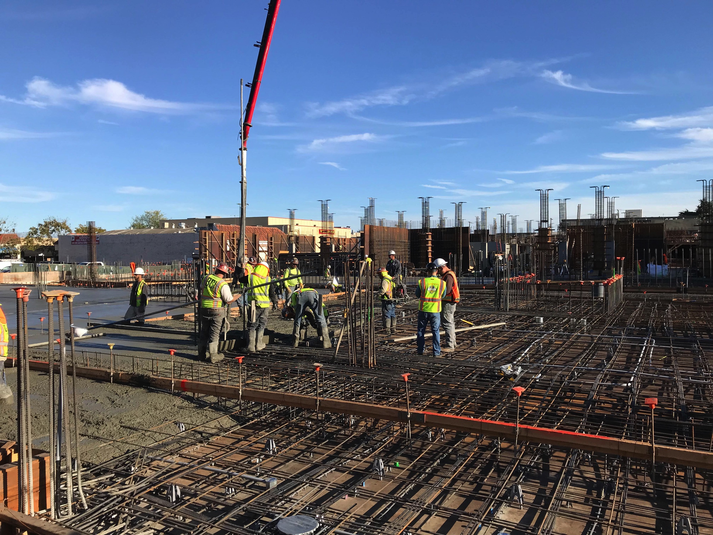 When I discovered Geoffrey’s, I also discovered their second-story balcony, which overlooks Wheeler Plaza. It is a great place to observe the nearby project and to take the occasional picture—although there are some trees that make it less than ideal for photography. Regardless, I’ve been watching the Wheeler Plaza project for quite some time and am impressed with the speed at which the mixed-use project is progressing. The five-story building will ultimately consist of one level of underground parking (for the building’s residents), two more levels of parking fronted by five retail spaces that will face San Carlos Avenue, and three levels of condominiums. Demolition for this project began just about a year ago, and after waiting through most of our last rainy season, by April crews had begun digging for the underground parking level. Now, the underground level is pretty much complete and crews are pouring concrete for the ground-level floors: