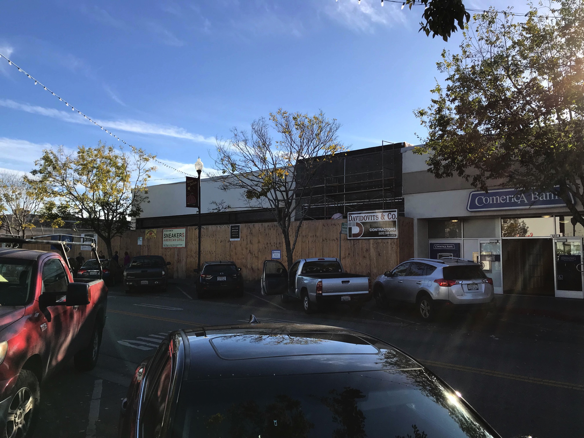 In the above, the portion of the building with the black tar paper along the top (behind the “Davidovits & Co.” sign) will be a retail space for an as-yet unknown tenant. To the left of that, the entire building that is visible will be, as the sign on the construction fencing indicates, the new home of Sneakers American Grill, who will be moving here from their current location on San Carlos Avenue. To the left of that, behind the trees, is a visible gap: this is where the two-story building, with office above and three retail spaces below, is being constructed. So far that building has yet to rise above the construction fencing, so there is little to see at the moment. It will rise to 34 feet in height (with a narrow 36-foot-high “tower” along most of the left-hand side that will hide the building’s heating and air conditioning equipment), well above the 20 foot height of the Sneakers building.