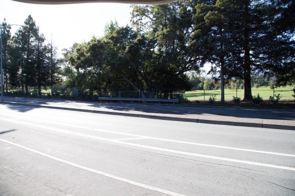 The creek effectively begins somewhere in or around the Menlo Country Club, a private golf club at the corner of Alameda de Las Pulgas and Woodside Road. For those of us who aren’t members, our first chance to see the creek is at the point where it ducks under Alameda. I’ve driven along Alameda de Las Pulgas countless times and never noticed that the creek runs beneath it. You’ll find the creek crossing just south of where Alameda and Fernside Street come together. Look for the short section of guardrail along an otherwise unprotected street edge: