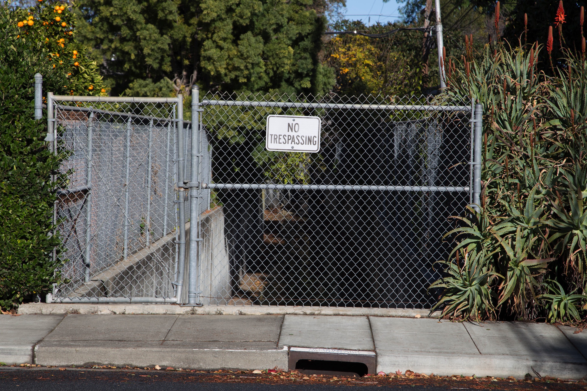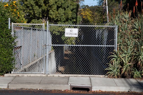 Here you’ll only see the creek on the west side of Alameda de Las Pulgas: on the east side there is a driveway beneath which, I’m guessing, the creek runs. It appears to surface behind some homes, making its way to the next point of visibility when it crosses Maryland Street, between Maddux Drive and Carolina Avenue. This crossing is like many that you see (or don’t see; if you drive by them, you hardly notice them) in Redwood City: a simple chain link fence, often with a gate and always with a prominent “No Trespassing” sign on either side of the street lets you see, but not enter, the concrete-lined waterway.