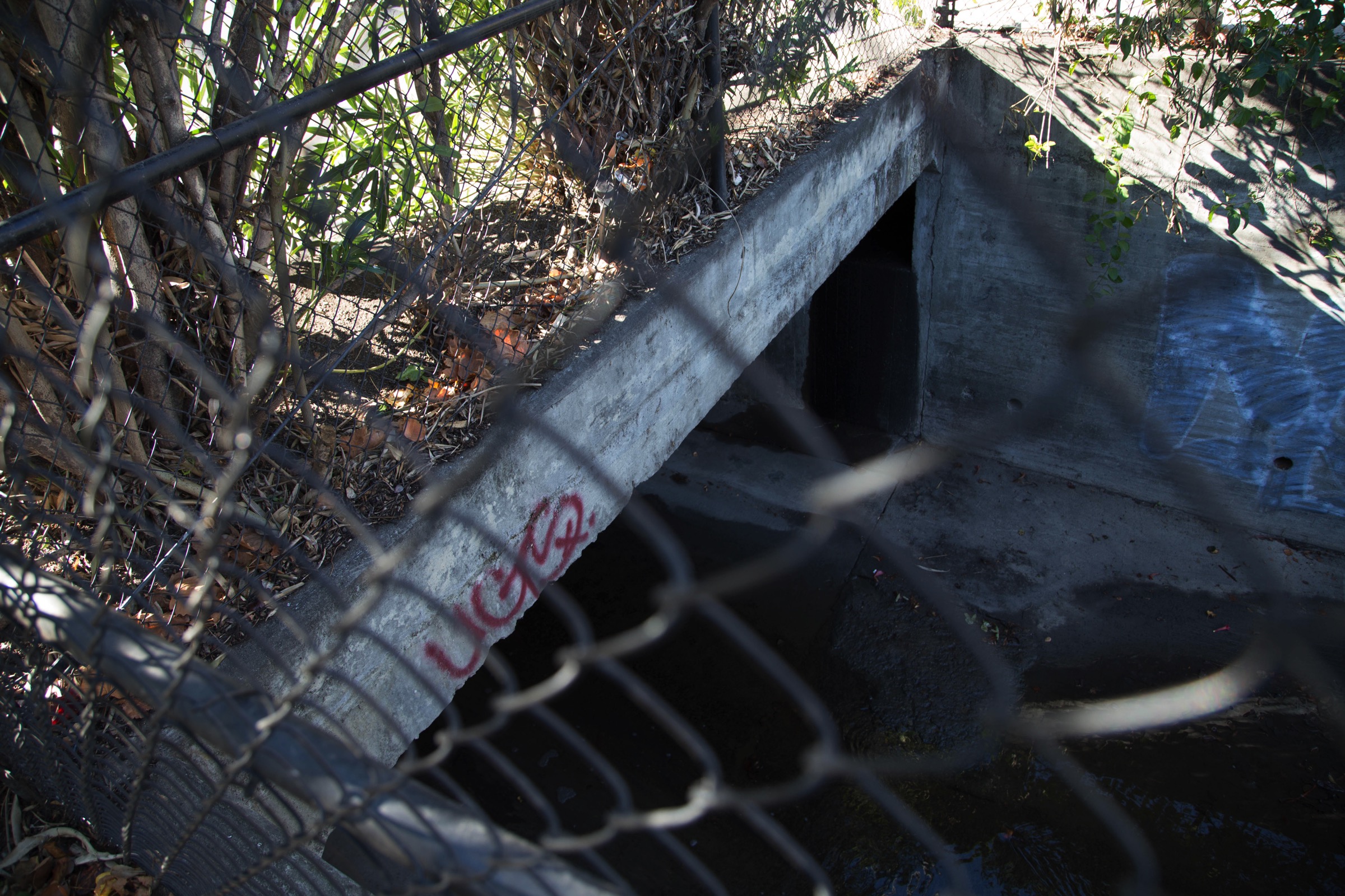 When Redwood Creek hits El Camino Real it, still underground, follows that street north to Maple Street, where it crosses to the east side of El Camino and once again re-emerges into the light of day—right alongside Maple, between it and Hopkins Acura. Next time you are stopped on El Camino Real at Maple Street, notice the large oleander growing at the intersection on the southeast corner. If you duck behind that plant, as I did, you’ll see the waters of Redwood Creek re-emerging back into the open air:
