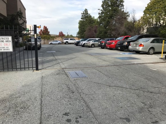 As I mentioned in last week’s blog post, an office building has been proposed for this site. I’ll write more about that building in a future post. For now, though, I’m staying focused on the creek. After crossing under Maple Street you can just see a bit of it before it goes underground yet again, first to pass beneath the Caltrain tracks. Then it continues underground, first to the southeast of the main library (it passes beneath the Roselli “mini-park,” which is on that side of the library), then across Middlefield Road and beneath the plaza that separates City Hall from Donato Enoteca. It then runs straight beneath the Main Street parking lot, crosses Broadway at the aptly named Redwood Creek Crossing, and follows the entrance into the Marshall Street Parking Garage. (If you haven’t noticed it before, take a look at the sidewalk as it crosses over the underground creek: on both sides of Broadway the sidewalk changes color, providing a subtle hint as to the existence of the subterranean channel below.)