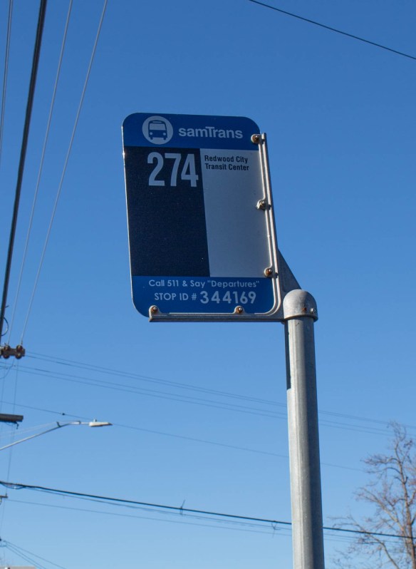 As you can see, it clearly indicates the route number (274) and the bus’s ultimate destination (“Redwood City Transit Center”). It also includes a unique ID number for the stop that you can use to find out when the next bus will arrive, either by entering the ID on the 511.org website or by dialing 511, saying the word “Departures,” and providing the stop ID number.