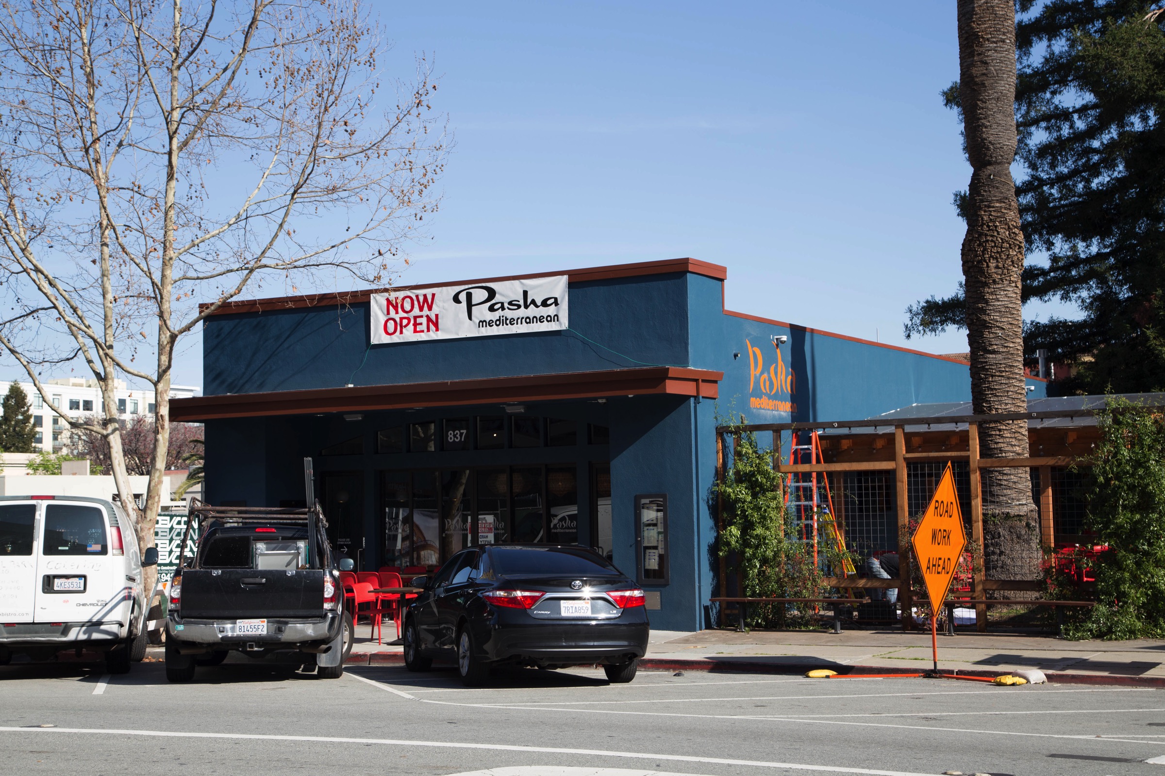 The sign above the doors says it all: Pasha Mediterranean opened for business this week. Workers were still doing a bit of touch-up when I went by—the ladder you can see in their outside seating area was being used by a sign painter who was working on the orange lettering you see on the building’s side—but I noted a few customers sitting both inside and in the patio area.