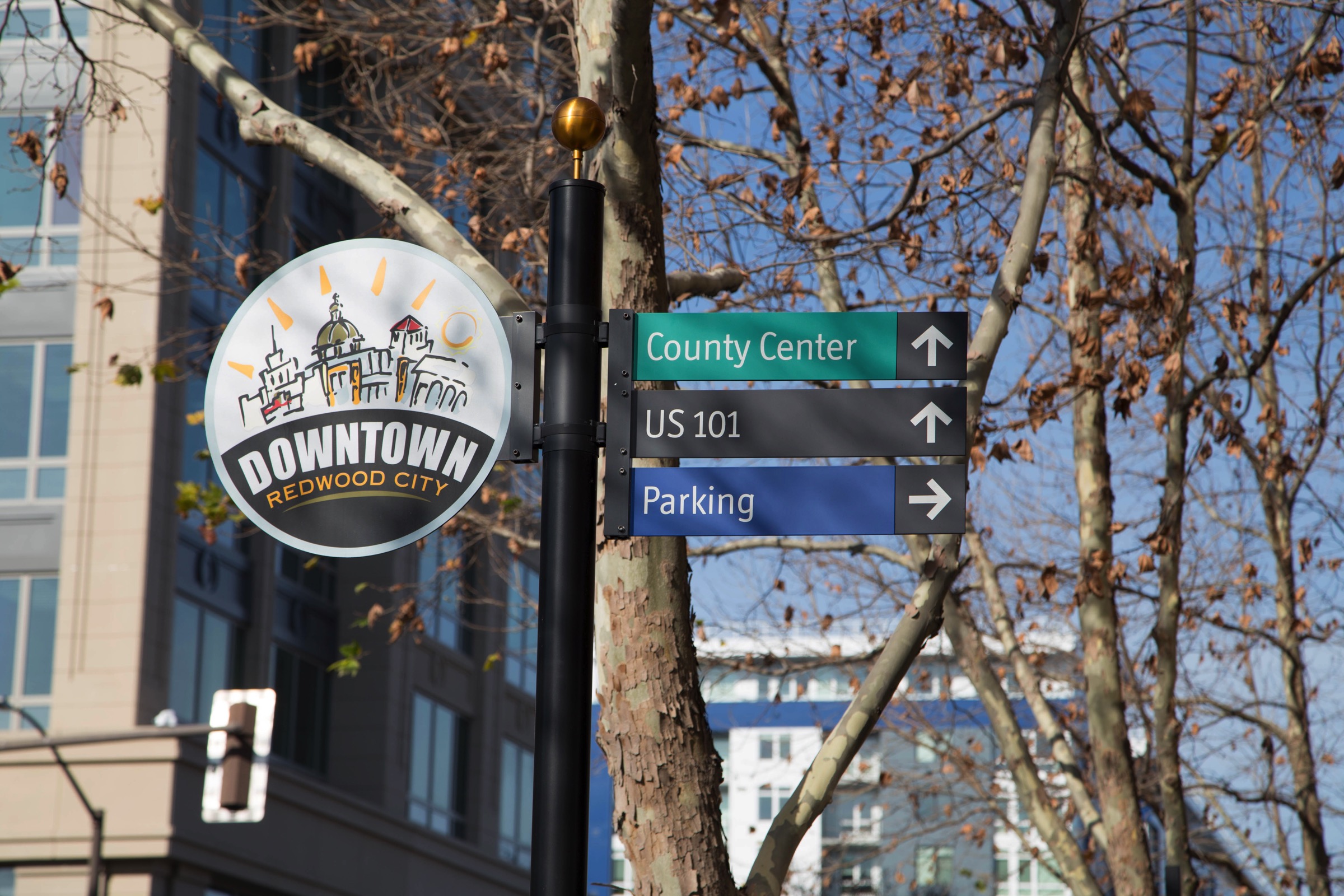First off, there are the signs that direct you from the major thoroughfares through Redwood City into our downtown. For instance, there is this one in El Camino Real: