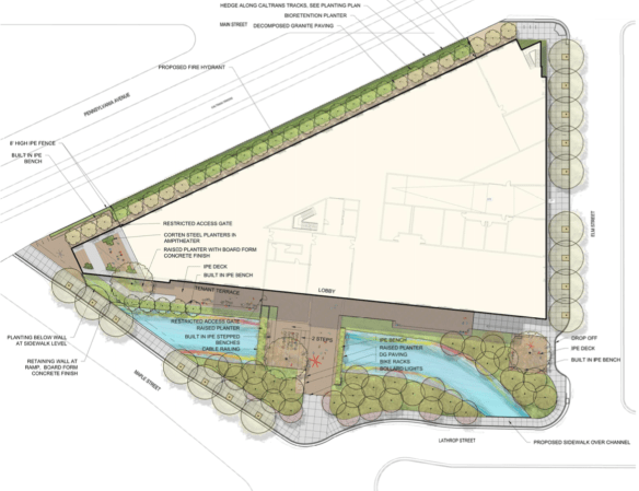 550 Allerton shows that Premia can fit a building onto an unusually shaped lot, an ability that will come in handy on the 1180 Main Street project. The property is somewhat pentagonal (five-sided), but Redwood Creek, which cuts through one side of the property, complicates matters. What Premia has done is design a triangular building with a “bridge-top park” that spans the creek and funnels people into the entry plaza that fronts the building’s main lobby. To better understand just how this would work, look at this preliminary landscape plan that the developer provided: