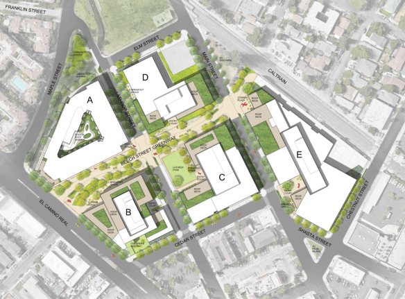 Greystar clearly knows a good thing when they see it, which is why they’re back with their newest project proposal: the Beech Street project (or, as it is referred to on the city’s Development Projects web page, “1601 El Camino Real”). Unlike their previous four projects, this one is not a single building, and it includes a significant office component. While the project they are proposing does include a residential building, Greystar has managed to cobble together several properties and is proposing to build one apartment building and four office buildings on what today is six blocks (totaling 8.3 acres). Whereas the apartment building would be on a scale with what Greystar is currently building on El Camino Real—seven stories, stretching just over 81 feet in height—the office buildings would be noticeably smaller. One would be four stories high (61 feet) while the others would be three (47 feet). All told the four office buildings would provide roughly 590,000 square feet of office space.