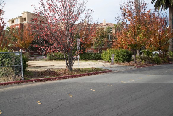 Between the buildings lies Beech Street, which begins at El Camino Real and runs through the complex towards the Caltrain tracks. This is what that section of Beech Street looks like today: