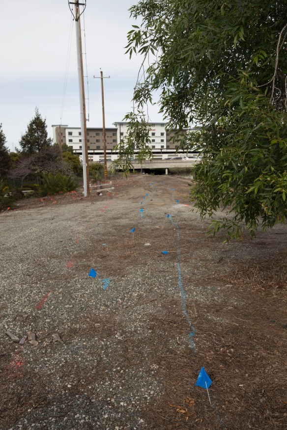 Finally, one more project: the U.S. Highway 101 Pedestrian Undercrossing Project is still getting its permits in order, but should be breaking ground soon. In the mean time, though, as I discovered while visiting our Toys ‘R Us store for perhaps the last time prior to its closing, PG&E has already been doing some needed utility relocation work. While there I observed a power pole lying on the ground along with lines of blue and red flags to indicate either where the new pathway will go or where utilities are or will be moved to: