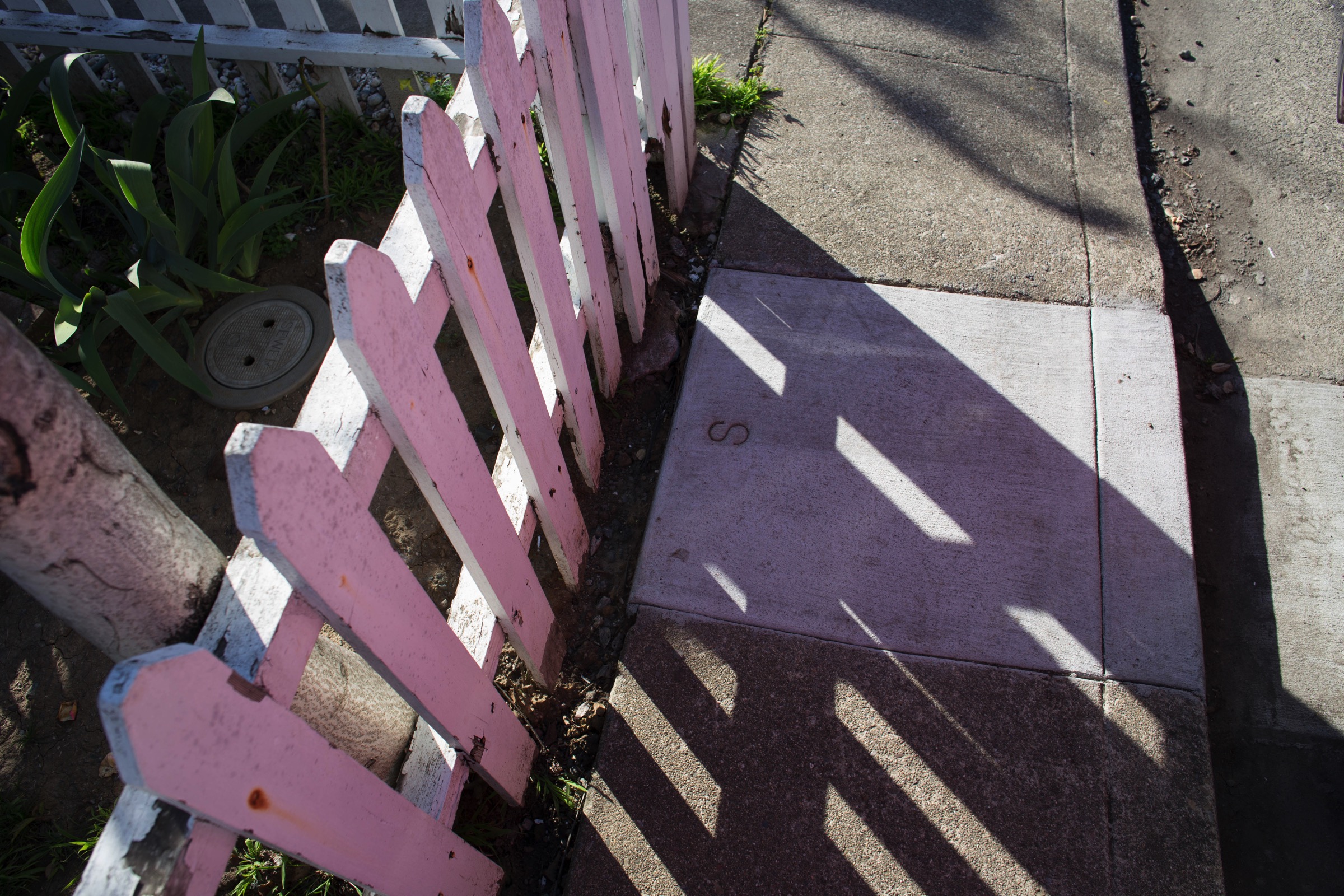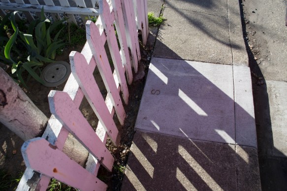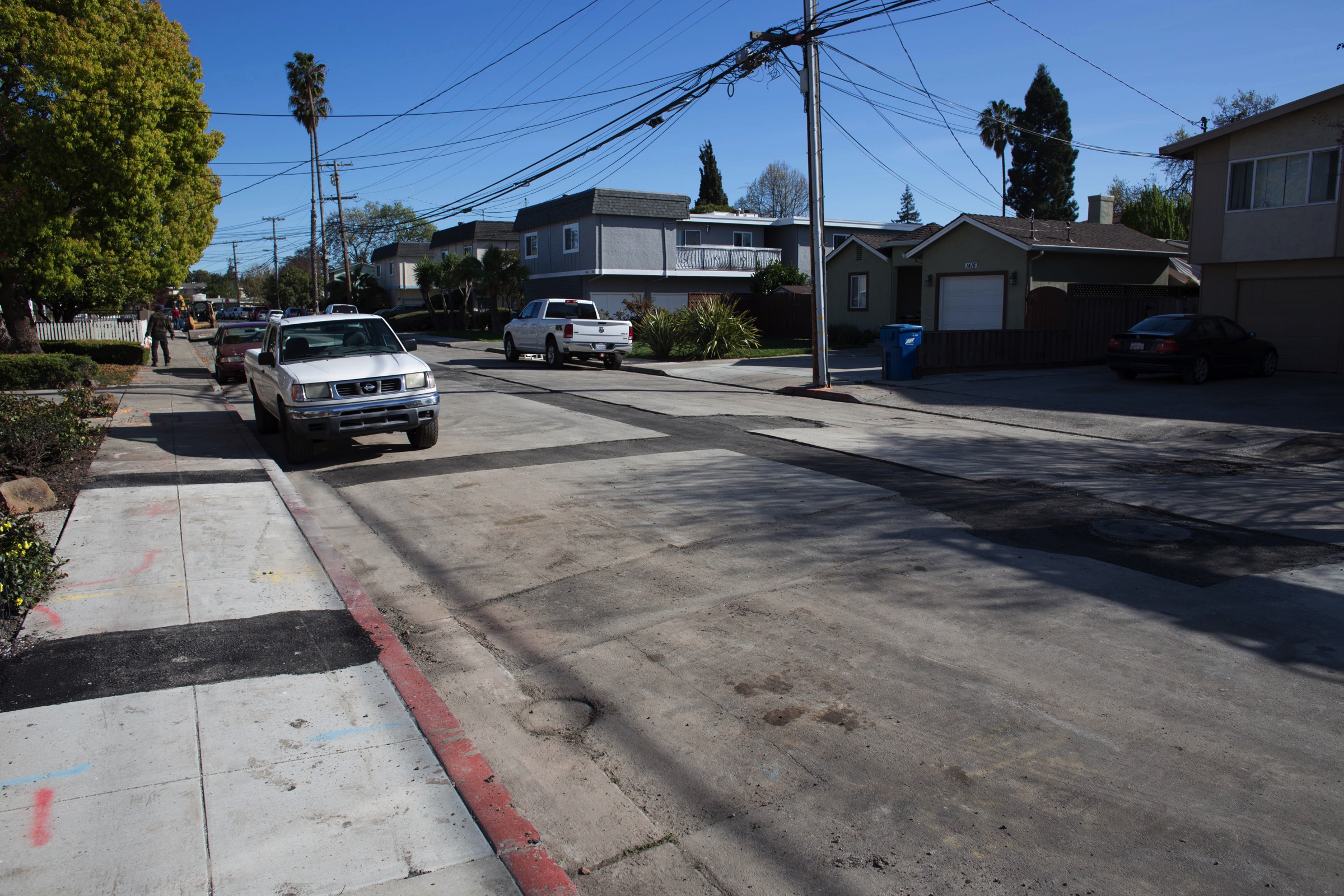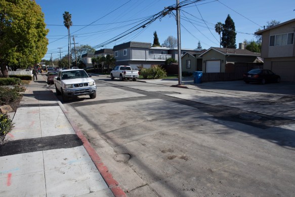 Replacing old sewer and water lines is something that the city has been doing for a long time. Periodically they select a new part of the city and focus their efforts there. Lately they’ve been working on a number of streets on either side of Woodside Road, mostly in the vicinity of Hudson, Gordon, and Kentfield. When the contractors are working they are hard to miss, what with all of the cones, detour signs, and heavy equipment. But even after they have moved on, at least for a while, it’s easy to tell that they’ve been there: telltale paving stripes indicate where the sewer and water lines were dug up and replaced.