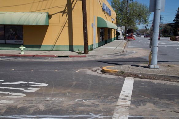 The work at the Broadway crossing has been going on the longest, with the bulk of the work so far being done primarily behind the construction fencing shown above. As yet it appears that the contractors have been doing utility work beneath the pavers. But take a look at the intersection of Broadway and Arguello, and you’ll notice markings on the street hinting at what is to come. On Arguello where it approaches the Broadway intersection, the street will be re-striped, altering the traffic pattern somewhat. Here is what that section of road looks like today: