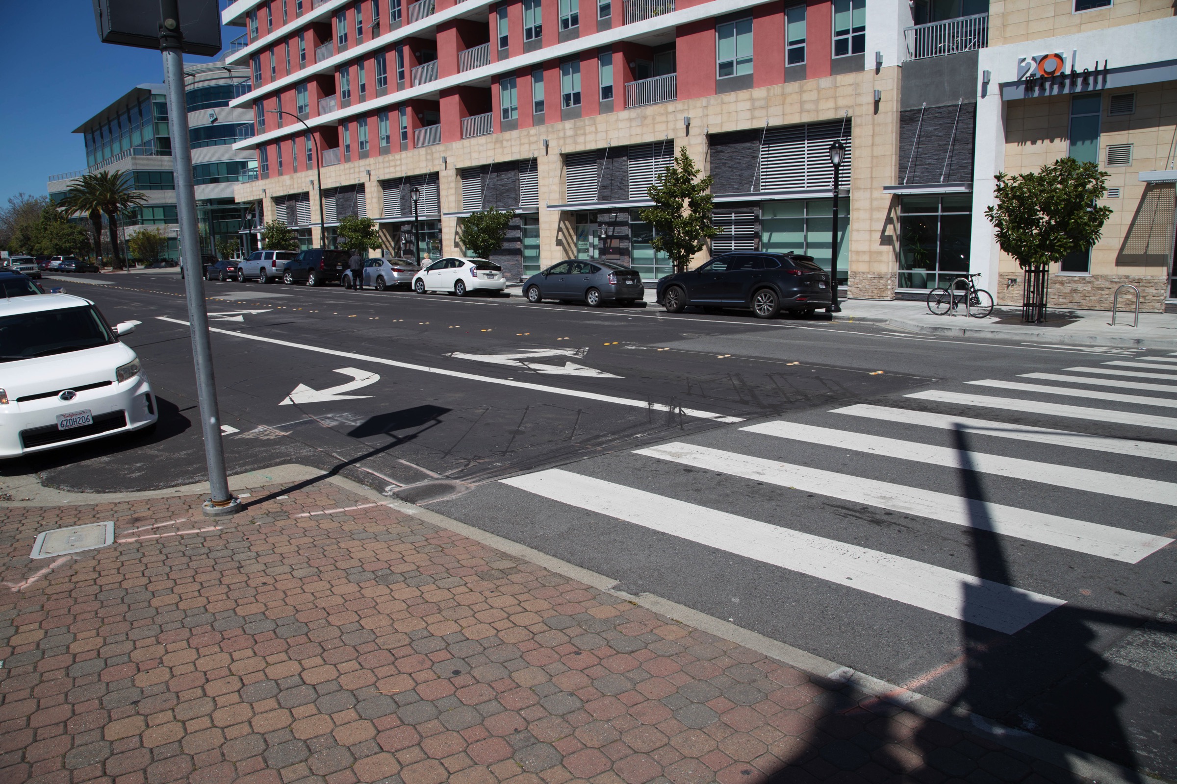 At Whipple, the intersection is being updated with new signs (mostly, to indicate the lane changes that occur between the tracks and El Camino Real), new pavement markings, and some updated electrical equipment. Its most substantial changes are reserved for where Stafford Street runs into Whipple. Today, a pedestrian crossing Stafford on the north side of Whipple has to navigate this unmarked (for the pedestrian) intersection: