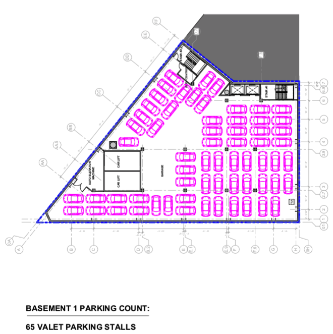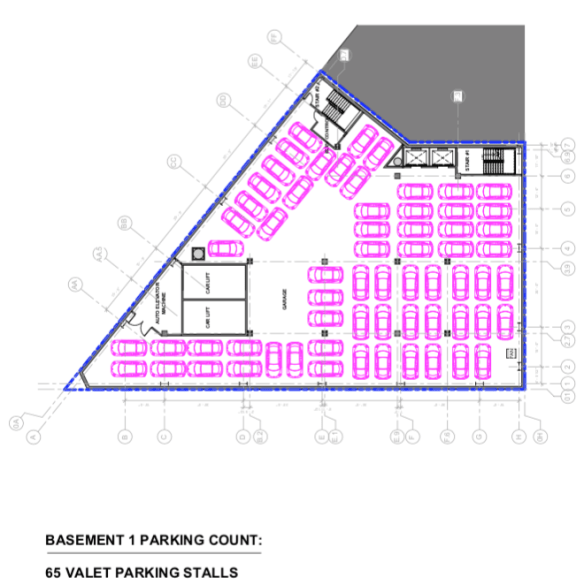 That tight footprint also doesn’t allow for conventional parking spaces; in order to squeeze in the requisite 148 cars, they will be packed in like sardines, with all parking in the two underground levels performed by valets. Apparently, the cars will be arranged in one of the underground levels (the other would utilize the same layout) something like this: