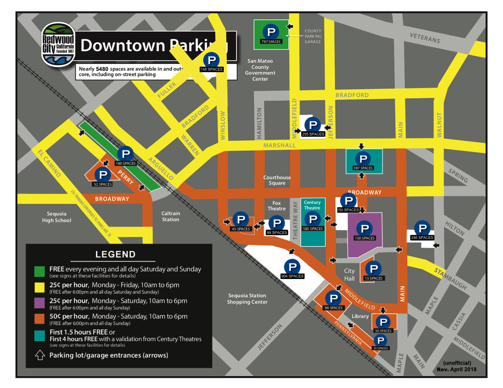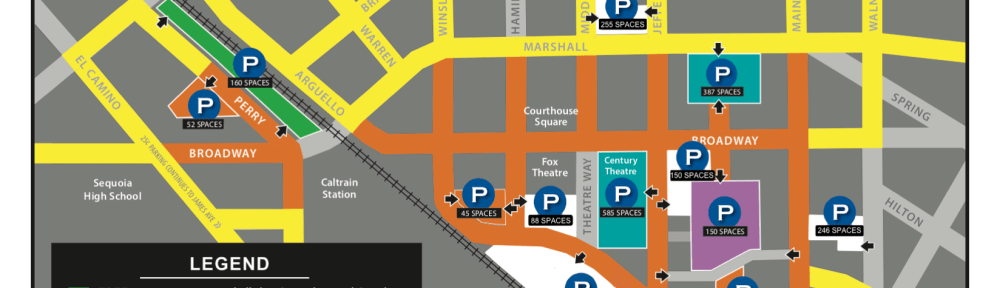 So that’s our downtown parking future. Once all of these new buildings have been completed and are fully online, we will have gained close to 1600 new public parking spaces since that first map was drawn. Although these new spaces are only available to the public on nights, weekends, and evenings, as the city has repeatedly noted there are usually plenty of available parking spaces in our downtown during the daytime (hint: always check the Century Theatres garage and the Marshall Street garage; even at lunchtime there always seems to be room). Most, if not all, of these new garages should have electronic signs that indicate the number of available spaces, and hopefully soon we’ll have strategically placed signs throughout downtown directing motorists to garages with available parking. Until those signs are erected, though, I recommend that you familiarize yourself with the parking maps that the city maintains. Knowing your way around Redwood City’s parking lots and garages can go a long way towards making your visit a satisfying and successful one.