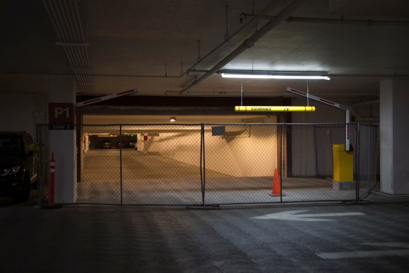 This garage has two below-ground levels and two above-ground levels. After driving into the entrance between the two buildings, you then take one of two left turns: one takes you to the two underground levels, while the other takes you to the two above-ground levels.