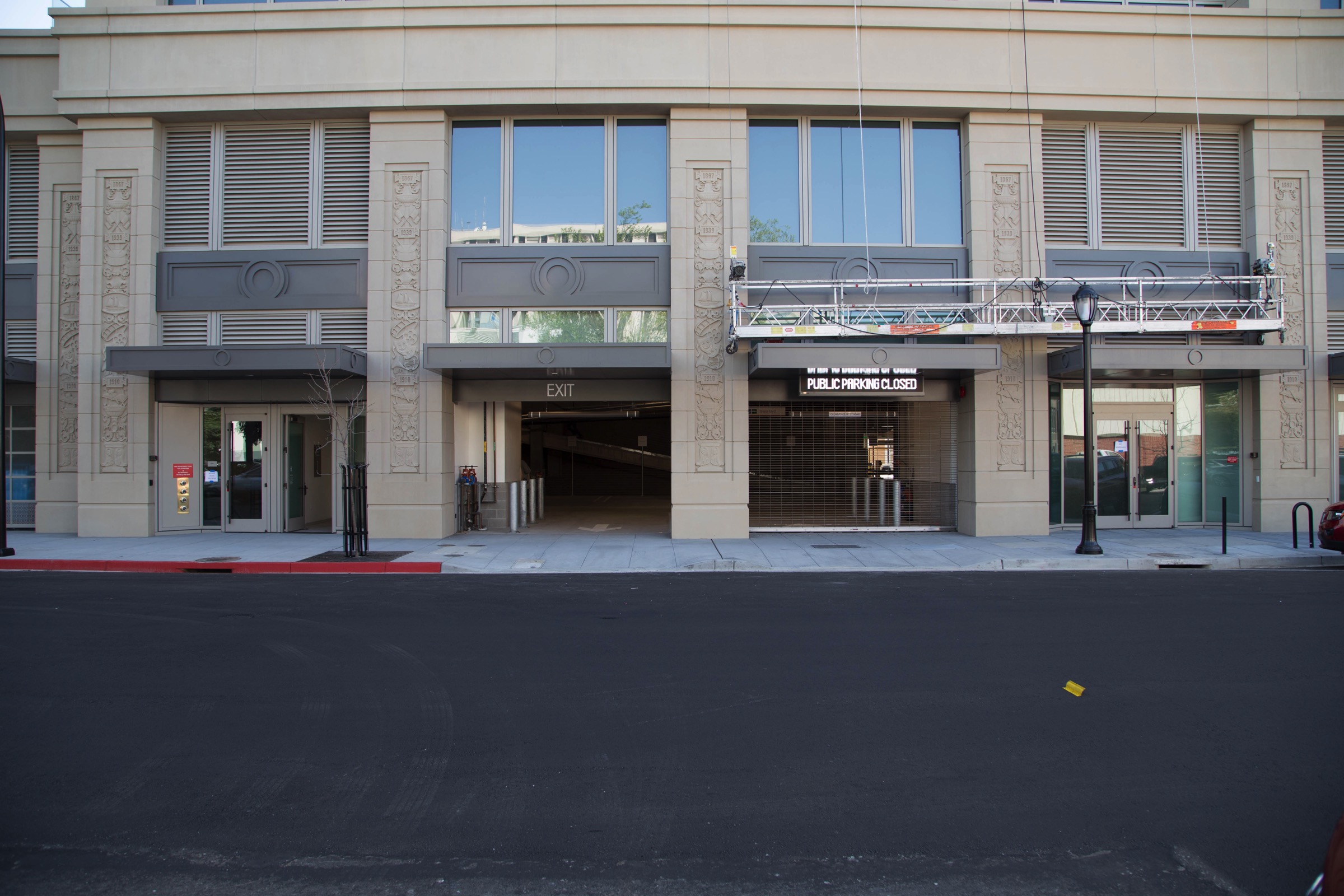 This building is located on Marshall Street between Middlefield and Jefferson, kitty-corner from Courthouse Square. Its five-level, 255-space underground garage (13 of those spaces are for motorcycles) takes advantage of the fact that it spans the entire block, with entrances on both Jefferson and Middlefield. Based upon current signage it appears that after parking pedestrians will exit the garage on the Middlefield side of the building.