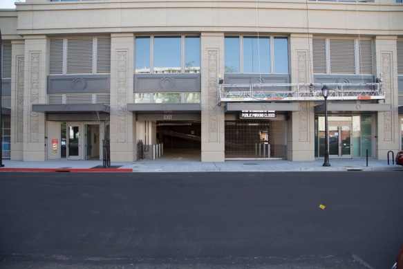This building is a bit off the beaten path, but, like the giant County Garage, is only a couple of blocks from the heart of Redwood City’s downtown. It has the most unusual design: because of the building’s relatively small footprint, there was no room in the two-level underground garage for ramps between the floors, so it employs “car lifts”—large elevators—to transport vehicles between levels. Here is what the garage entrance looks like; the doors to the car lifts are clearly visible along the back wall:
