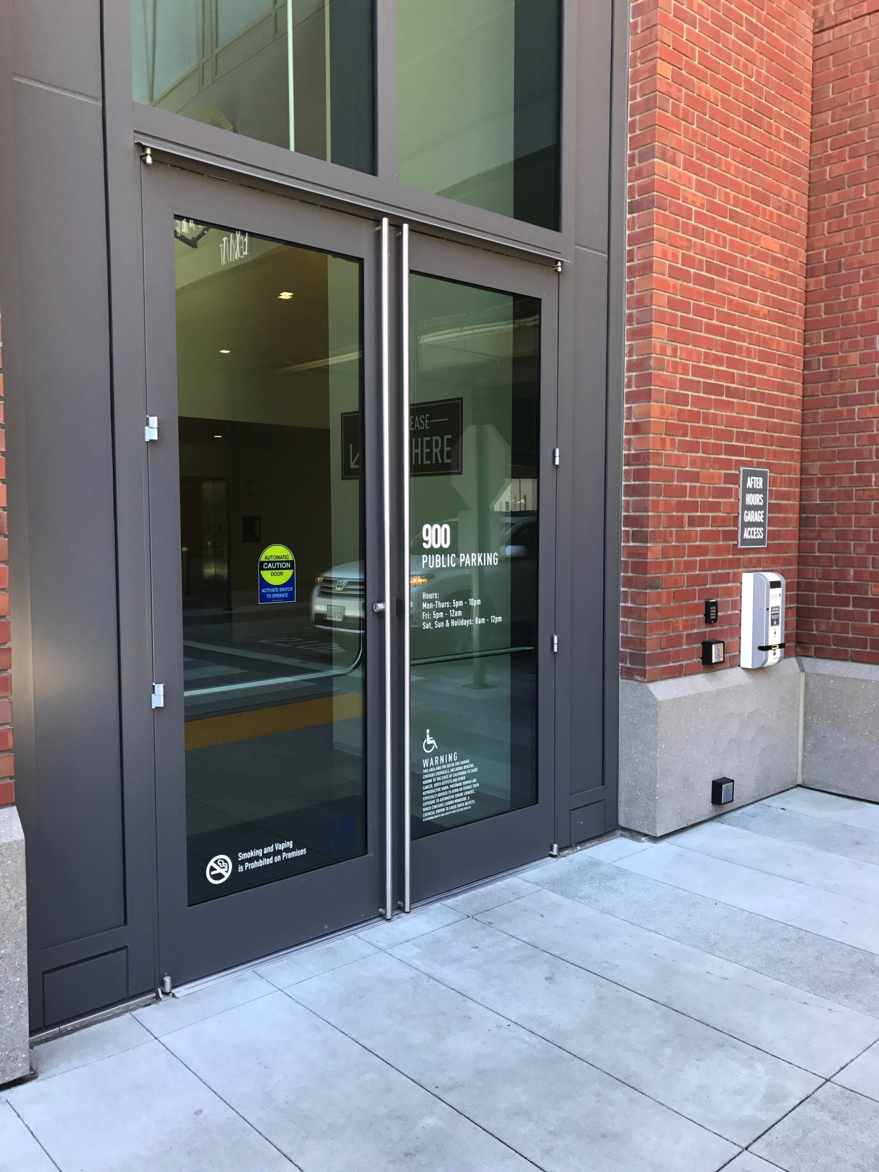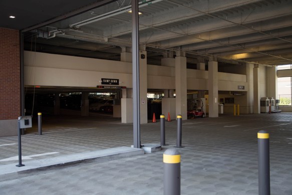 This garage operates pretty much the same as the Century Theater garage does: take a ticket upon entry (after electing to go up or down, you’ll encounter the machines), and pay before retrieving your car. The payment machine, I should note, is inside the left-hand building; when heading back into the garage, look for the glass doors labeled “900 Public Parking” on your left.