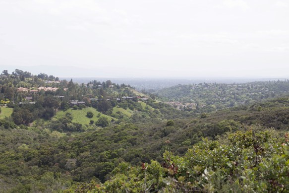 I always head straight into the Preserve at this point, but you can alternatively follow the paved road to the left for an additional 0.2 miles, which will take you to the start of the off-leash dog area. I plunge straight ahead, aiming for the “Dusky-footed Woodrat Trail,” which takes me to the end of a box canyon, which is the highest point in the Preserve (around 800 feet in elevation). Although the first part of the trail is heavily wooded, as you climb you’ll suddenly find yourself out in the open. Up there, on a clear day, you’ll get some breathtaking views. I was there on a somewhat hazy day, but still enjoyed the sights:
