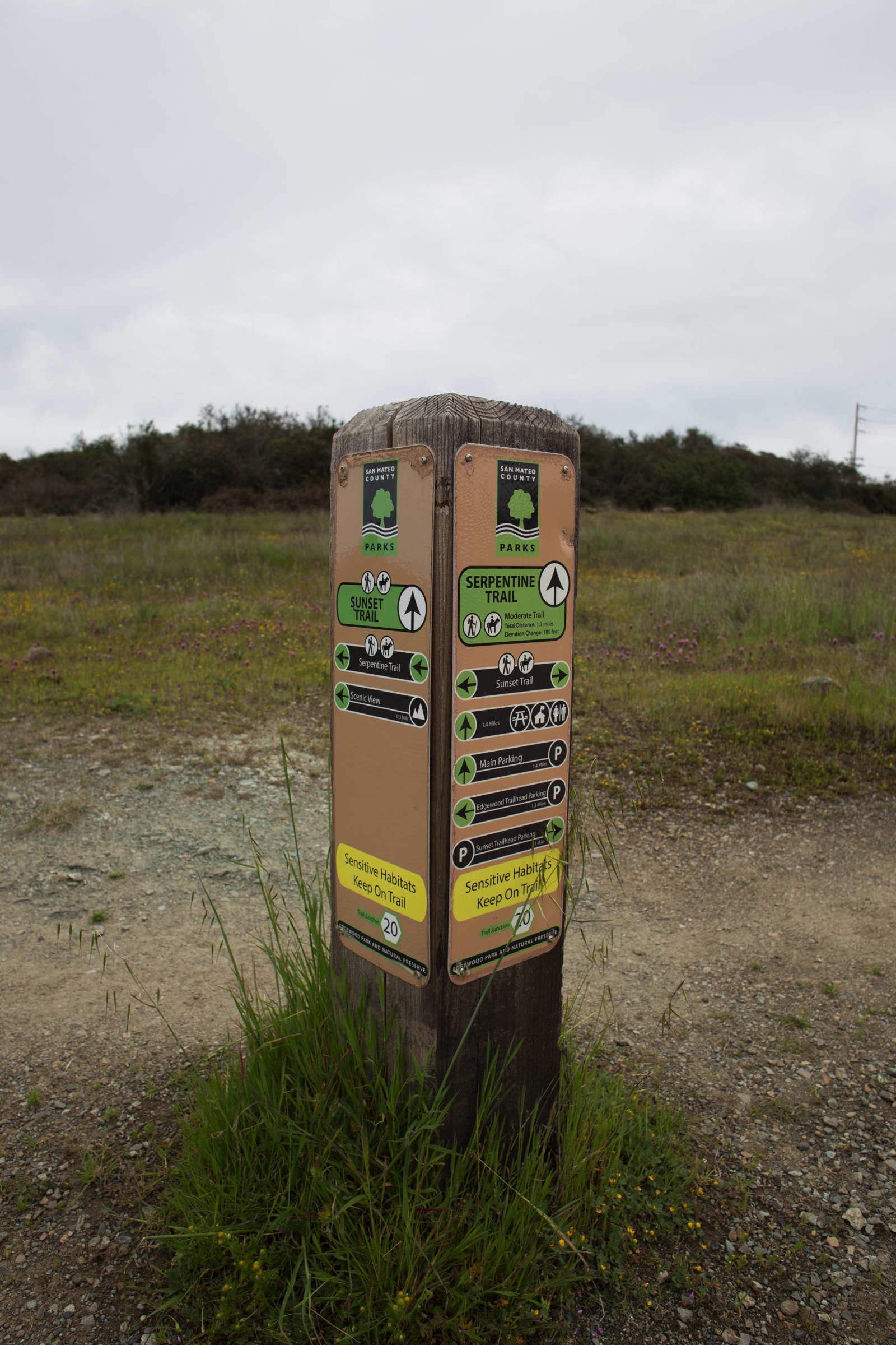 Pulgas Ridge, being an Open Space Preserve, has fewer amenities than Edgewood Park. There is a single bathroom in the parking lot, and three or four seating benches along the trails, but no drinking fountains or picnic benches. You will find an information kiosk in the parking lot by the trailhead that should be stocked with paper trail maps (an electronic version can be found here).