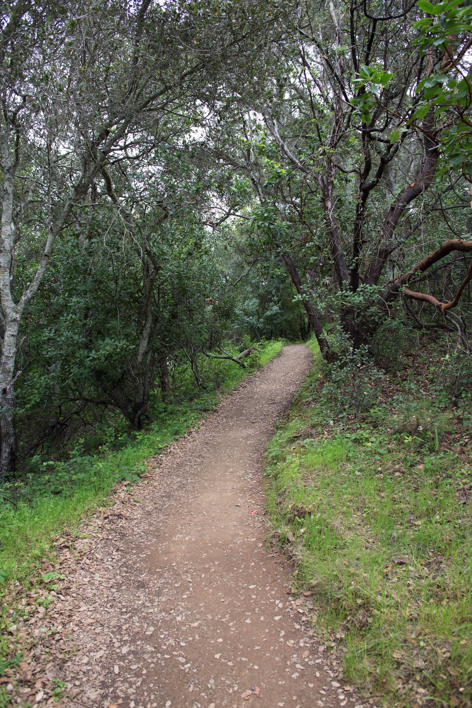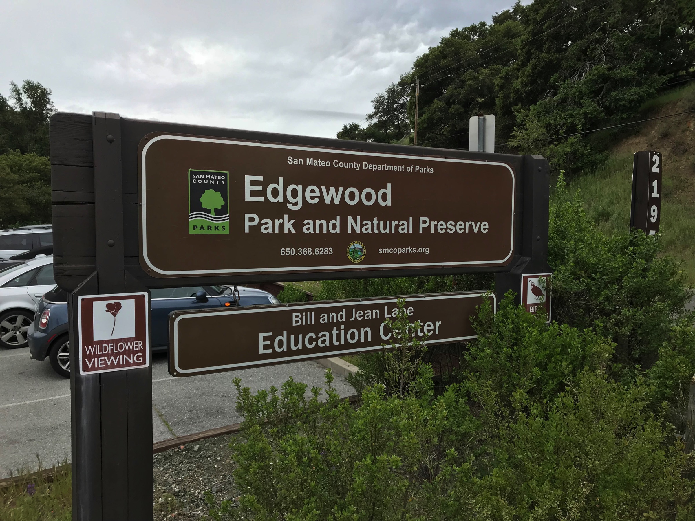 There is an entrance up in Emerald Hills, at the corner of Hillcrest Way and Sunset Way. There is no dedicated parking at this Sunset Trailhead, though—only neighborhood street parking. Because I’m willing to make the walk, and don’t have to concern myself with parking, I use that entrance a lot. If you are driving to the park, however, you may prefer one of the others. The main entrance on Edgewood Road is near to where Crestview Drive meets Edgewood (but on the south side of the street). There is a fair amount of parking here, especially when you include the “spillover” parking along Edgewood Road near the entrance. Another option is to park near the intersection of Edgewood Road and Cañada Road, and enter via the Edgewood Trailhead. Or, follow Cañada Road towards Woodside, and, after it passes under Highway 280, watch for the Clarkia Trailhead and its associated parking. Last but not least, if you live in or near downtown, or just prefer to park there, the County runs a free shuttle bus that goes from the Redwood City Transit Center to Edgewood Park on weekends; see https://parks.smcgov.org/ParkShuttle for more information, including the bus schedule.