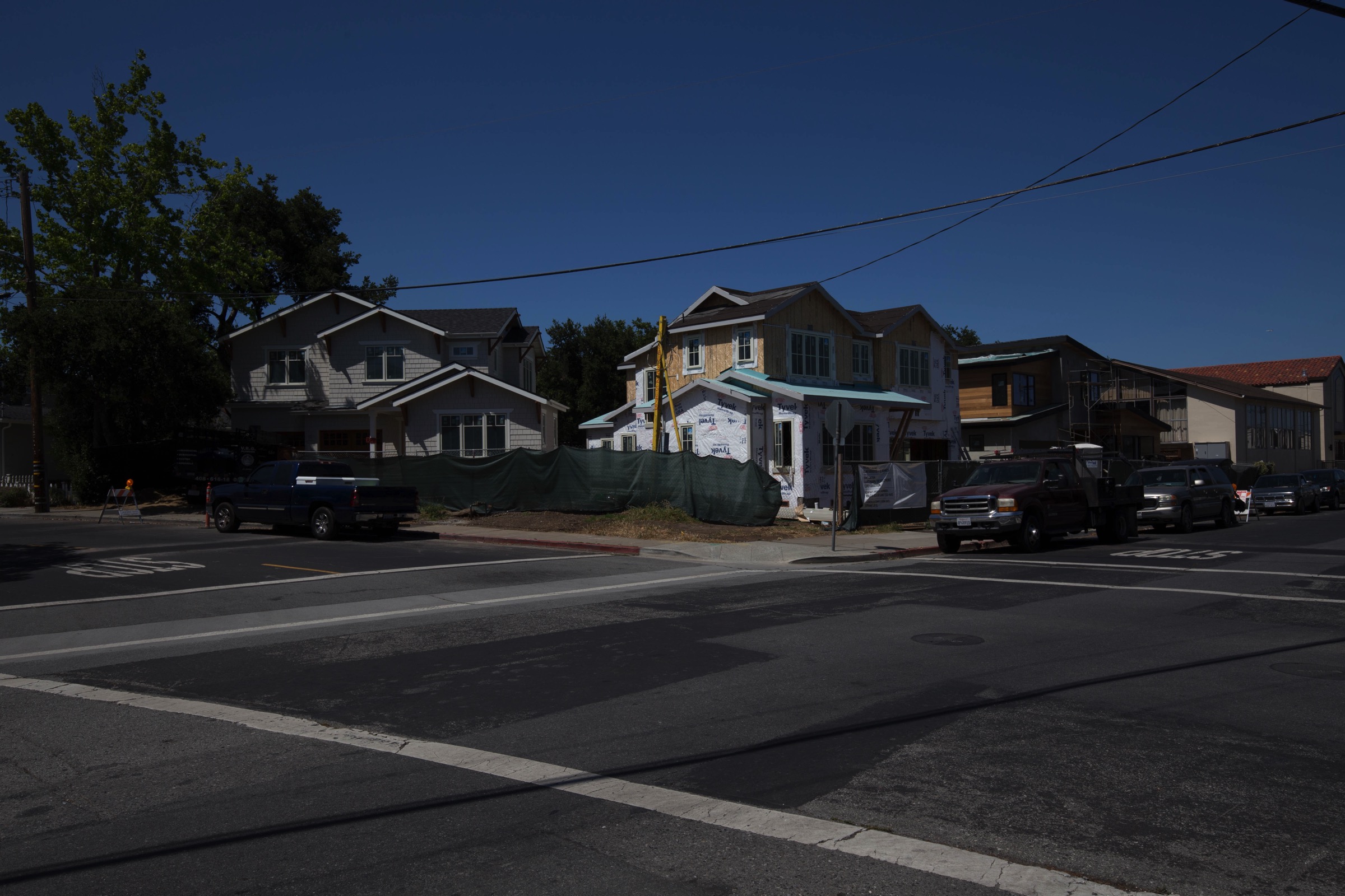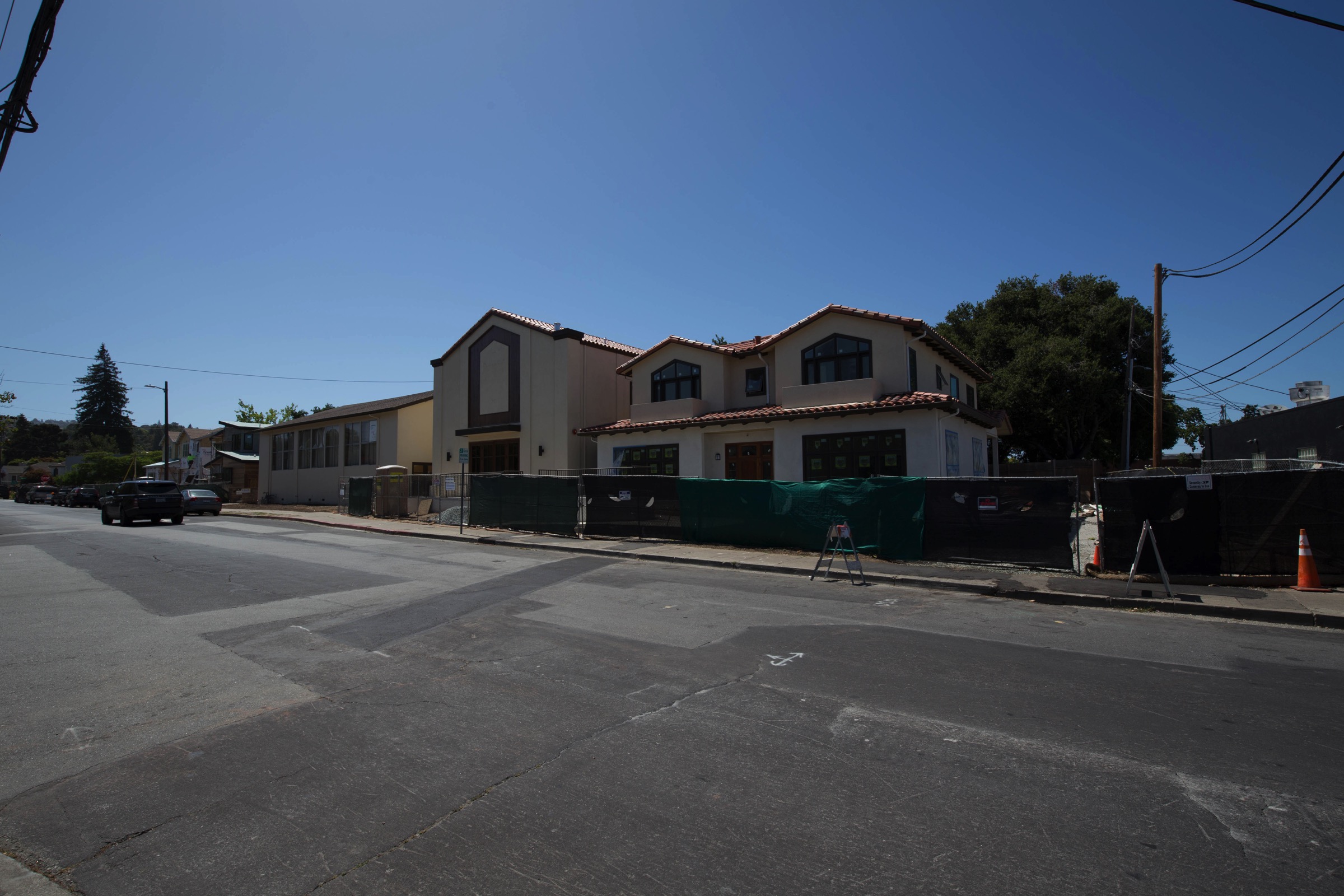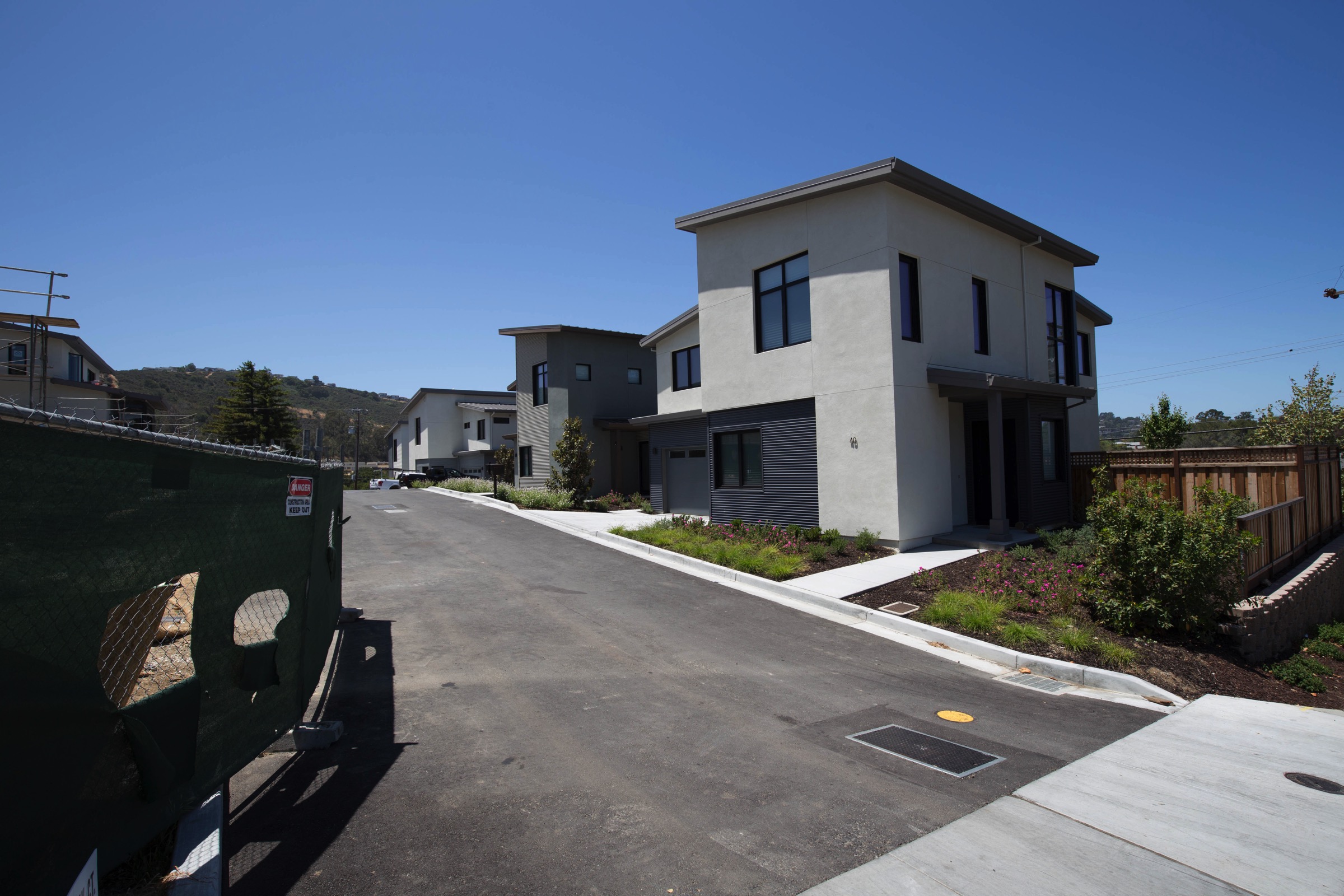 The project I was aiming for is the Gateway San Carlos housing development. At the corner of San Carlos Avenue and Club Drive, on a site that until recently housed a church, Clarum Communities is building eleven single-family homes. A banner on the construction fencing announces that these are “Modern 3 & 4 Bedroom Single Family Homes From Low $2,000,000s”. Based on their exterior appearance, they are indeed modern: