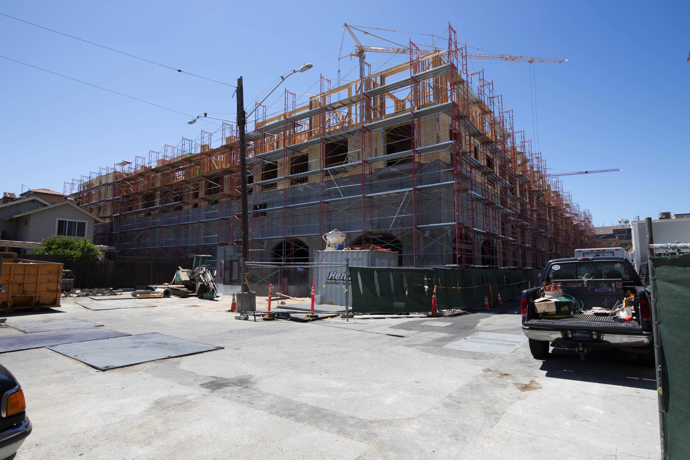 This project sits close to the massive Wheeler Plaza development that will occupy most of the block bounded by San Carlos Avenue, Laurel Street, Cherry Street, and Walnut Street. That project is at a similar point, with the underground garage and the first floor—which is also a set of poured-concrete commercial spaces—pretty much complete, with wooden framing for the upper residential floors well underway. I walked all the way around the Wheeler Plaza project and was awed by the amount of scaffolding that this project is using: